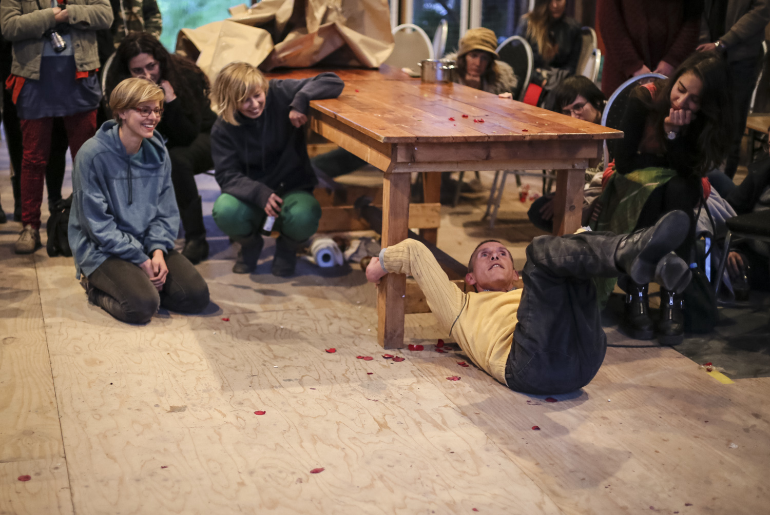 Rassemblés autour d’une grande table au centre du « Ding Dong Dom », lieu principal du mois de la performance, ou éparpillés dans la salle, nous avons d’emblée difficulté à distinguer les artistes du public. Nous sommes alors invités à déambuler dans l’espace, prendre également place à la table, discuter ou encore manger.