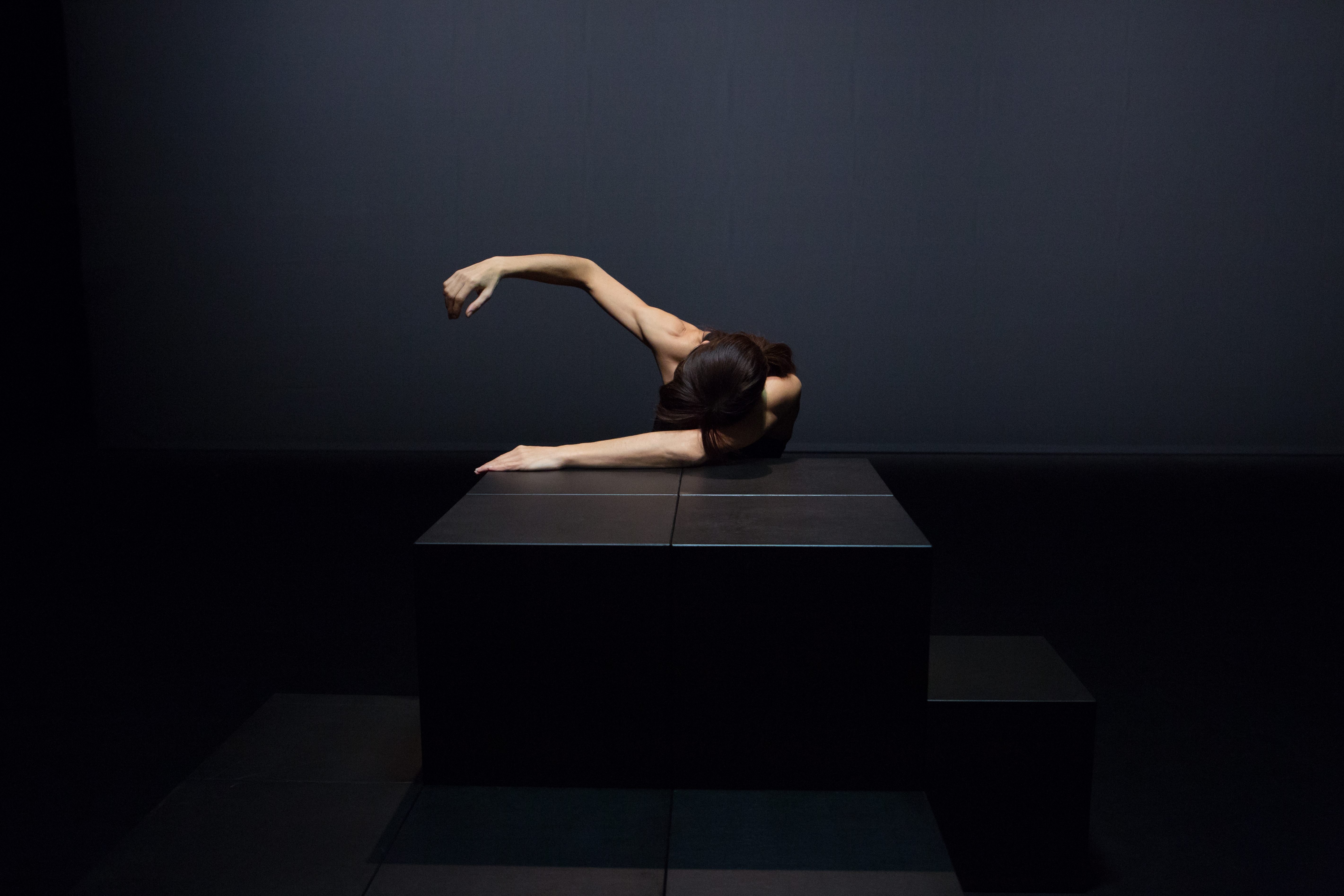 Dans ce contexte, Drift agit comme un glissement de terrain. Il s’agit d’une création chorégraphique à l’esthétique épurée, toute de clairs obscurs et de formes abstraites, qui se partage entre deux parties. Lors de la première, les deux danseuses, Cindy Van Acker elle-même et Tamara Bacci, évoluent sur scène comme dans une plaine grise, lunaire, où elles dansent entourées de cubes noirs. Elles les manipulent et glissent leurs corps à la souplesse éprouvée à l’intérieur de leurs interstices. A travers cette danse taillée par la lame d’un couteau et forgée dans l’acier le plus pur, les corps, qu’aucun affect ne touche, s’attachent à garder leur emprise sur les objets comme pour marquer leur différence avec la chose inanimée.