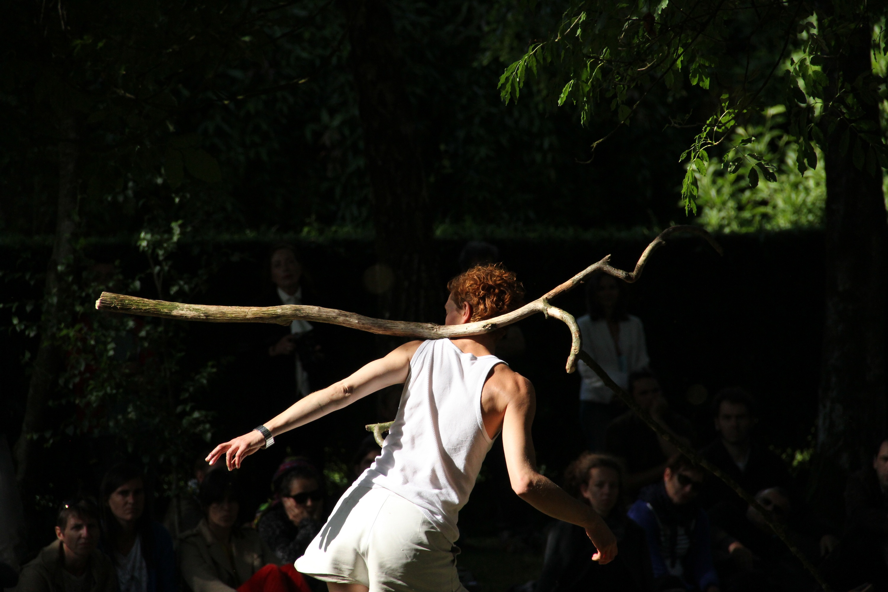 A la lumière du jour, les coups de hache d’Antonija Livingstone et Simone Aughterlony finissent par installer durablement le trouble. L’Extension sera indubitablement Sauvage cette année, insidieuse, insaisissable, agissant dans la durée avec la force d’une hantise. Les deux performeuses et chorégraphes attisent dans le petit bois de bouleaux du château de la Ballue des courants âpres, dans un tumultueux mélange de pulsions brutes – désir, virilité et sensualité explosives, attraction sexuelle irrésistible qui s’amplifient au contact des essences boisées. Toute fiction du genre déraille avec fracas. Le musicien et compositeur Hahn Rowe appuie par ses interventions vibrantes ce processus de devenir multiple, continuel, irrésistible, à la recherche d’un plaisir qui hurle son nom au niveau moléculaire. Une première version scénique d’In Disguise était créée quelques jours avant le festival à New York. Nous attendons avec impatience les suites de ce projet destiné à la Gessnerallee de Zurich, en 2015.