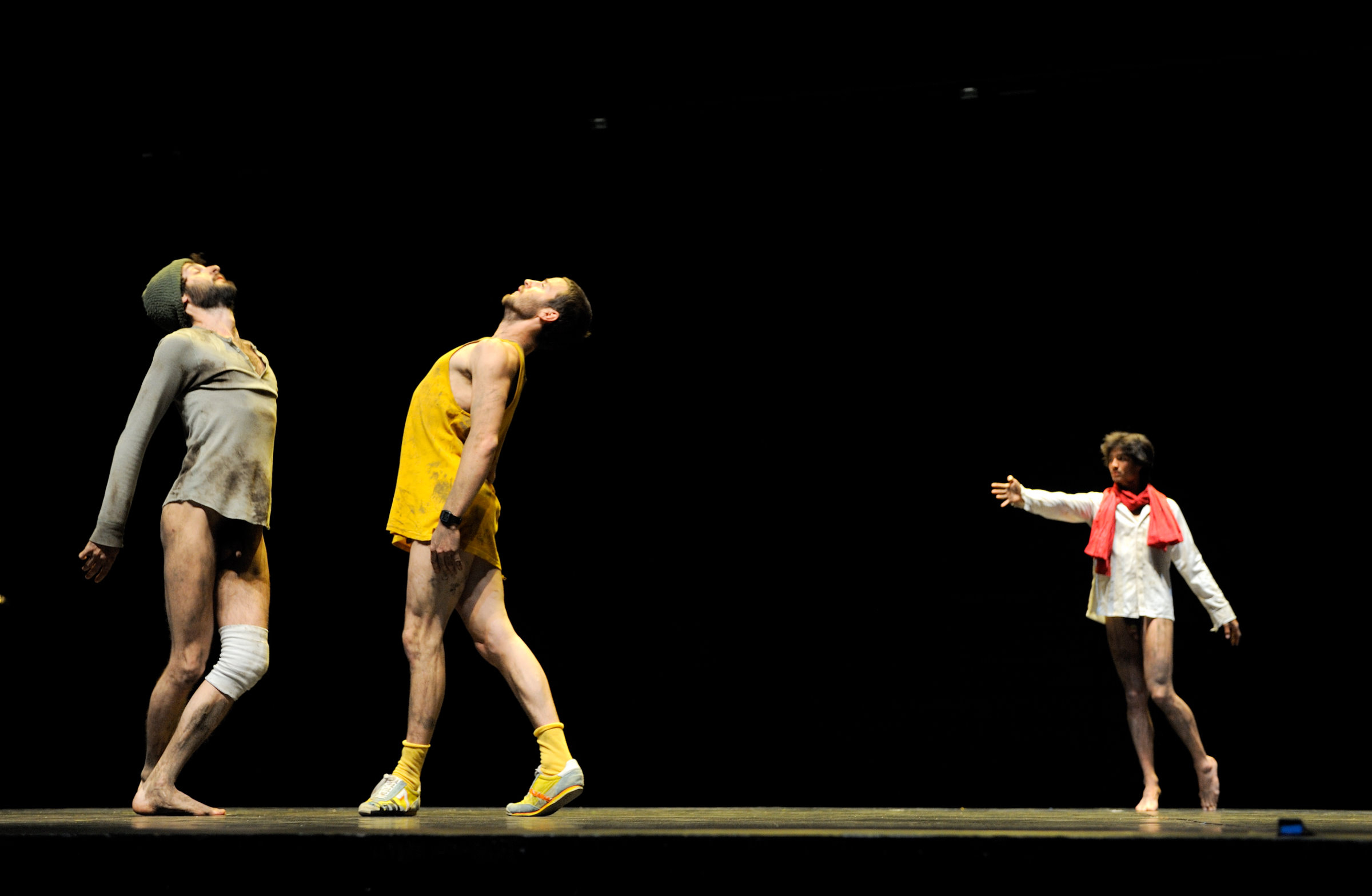 Trois mâles entrent en scène, un peu ahuris d’être là. Ils sont un peu sales et n’ont pas de pantalon. Ils se scrutent, se sentent, se jaugent. Ce pourrait être une race disparue de danseurs, qu’on aurait retrouvé perclus dans les loges d’un vieux théâtre. Des classiques de Neandertal. Époque pré-cunningham. Decouflé y a retrouvé par mal de ses congénères, dans cette réserve hors du temps.