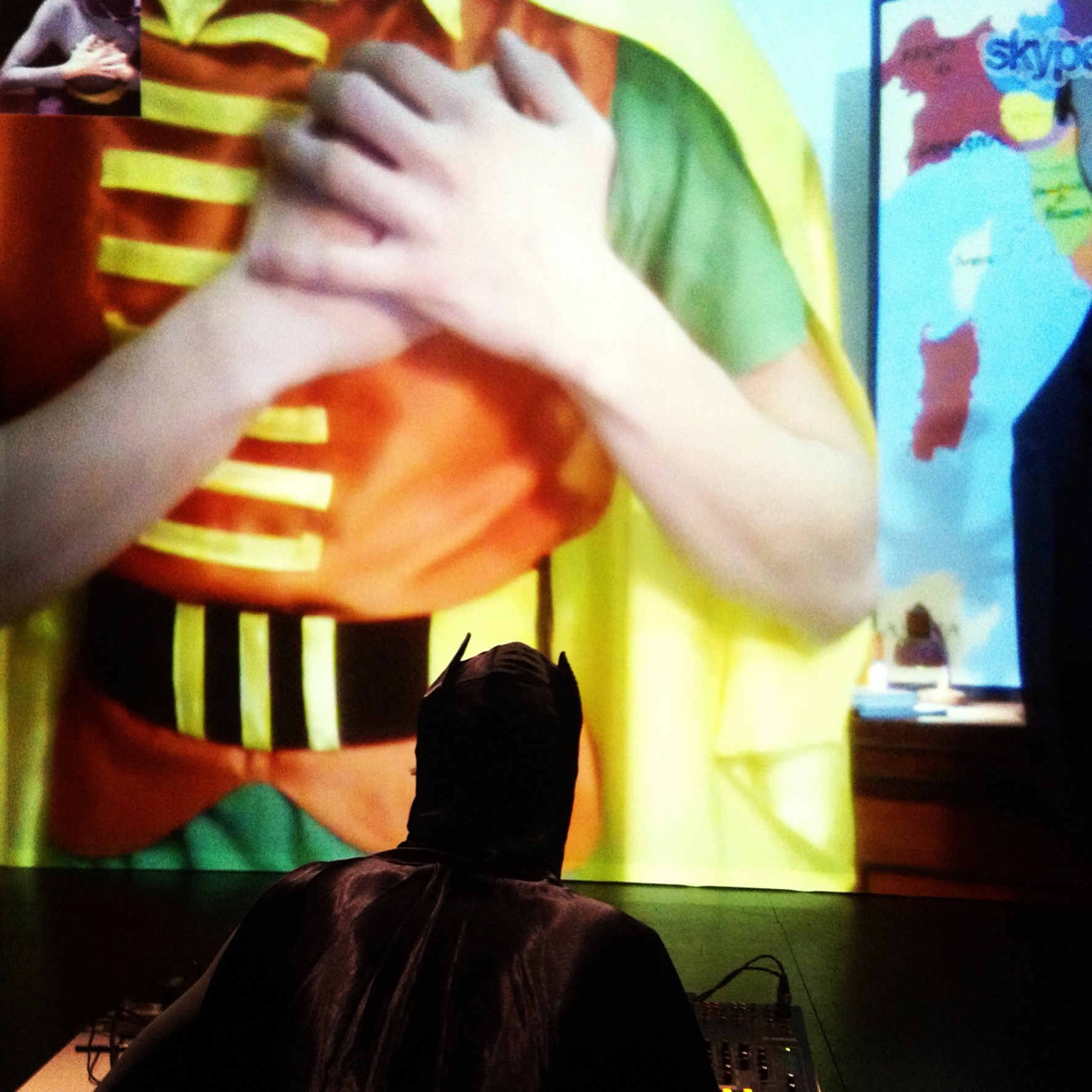 A la table, dos au public, le danseur-performer travaille sur son ordinateur. Son écran est retransmis en fond de scène. A l’aide d’une web-cam, le spectateur peut voir le danseur et se voir derrière. Certains enfants sont déjà sortis du spectacle tant ils sont incapables de quitter la fascination narcissique de leur image.