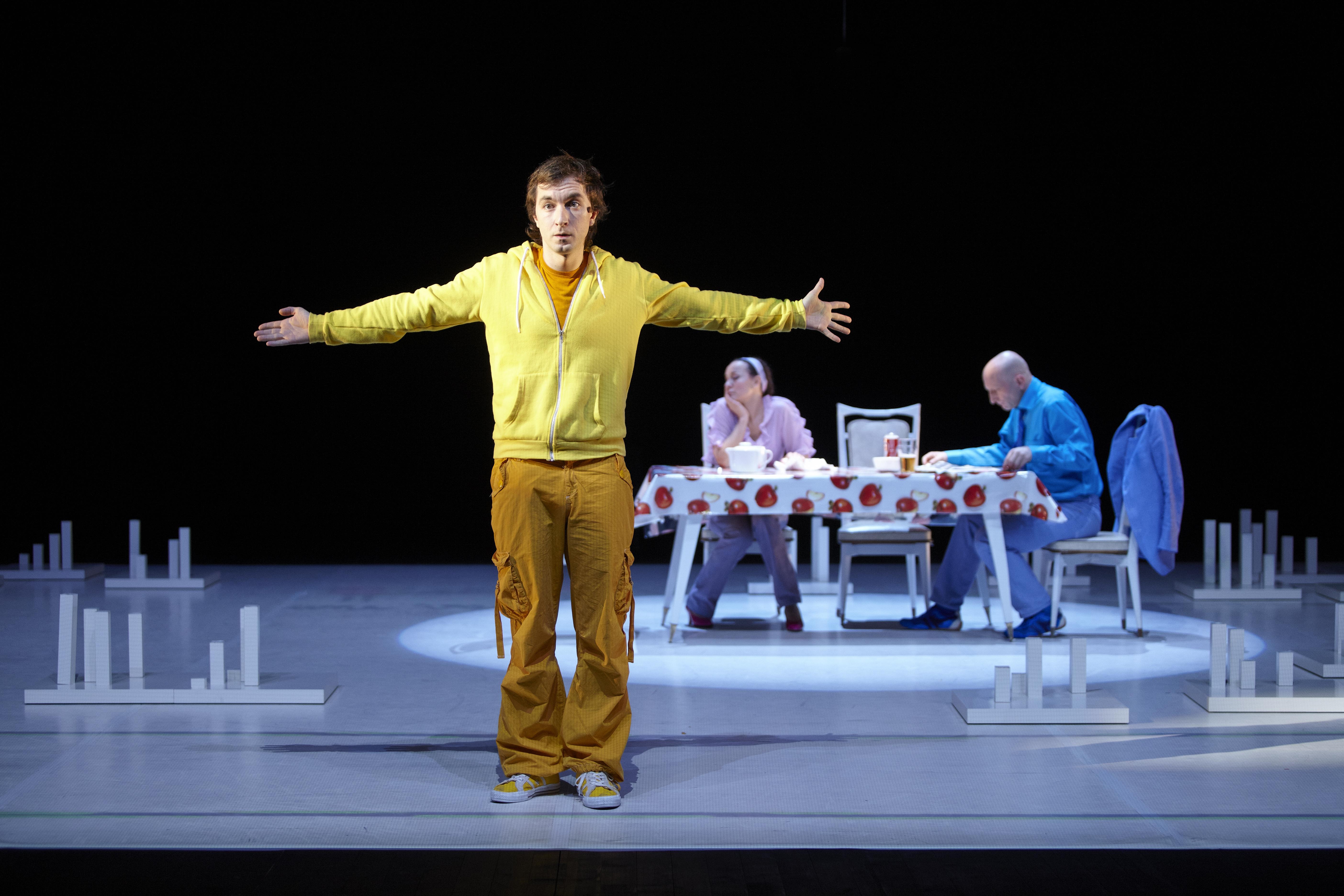 Sur le plateau, en quatre tableaux présentés dans un fondu enchaîné qui remonte le temps, hydre dévorante qui se mord la queue, en quatre heures marquées par une césure d’une demi-heure pour permettre au spectateur de reprendre pied dans une réalité qui « se dérobe » progressivement à lui – au sens de se mettre à nu – les personnages « se mettent à table ». Au propre comme au figuré. C’est en effet autour de cette pièce de mobilier qui occupe la scène, plaque tournante des fantômes qui s’agitent en chacun d’eux, que les restes mnésiques de ce qui les fondent vont se dire. Réunis autour de la table familiale, de cet endroit où anorexie et boulimie disent en boucle le trop plein d’un passé qui insiste et n’arrive pas à passer, que les personnages vont mastiquer longuement avant de déglutir – jusqu’au risque de le vomir – ce qui alimente leurs névroses héritées.