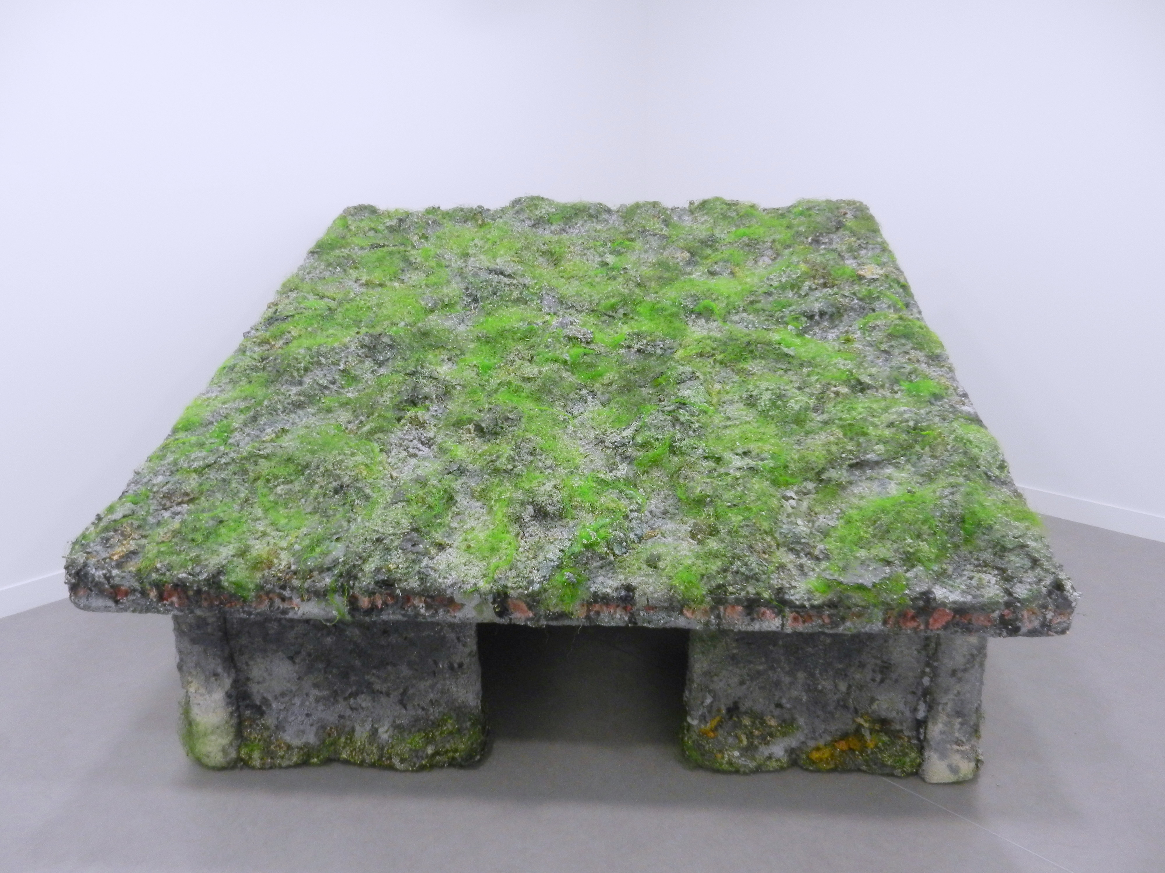 La première salle introduit la question de la structuration de l’espace. L’élément architectural fait l’objet de représentations de toutes formes et de tout médium. Les oeuvres construisent ici un lieu et nous invitent à composer visuellement un habitat possible. Au sol, la pièce de Morgane Tschiember évoque des objets fragiles, comme des éléments de construction possible. Les oeuvres de Thomas Fougeirol et Bettie Nin, telles des parois jouent sur nos manières de percevoir les murs, les fenêtres et les clotûres. Dans ses photographies, Alain Declercq porte son regard sur le paysage urbain. De ces pavillons photographiés naissent la représentation d’un quartier.