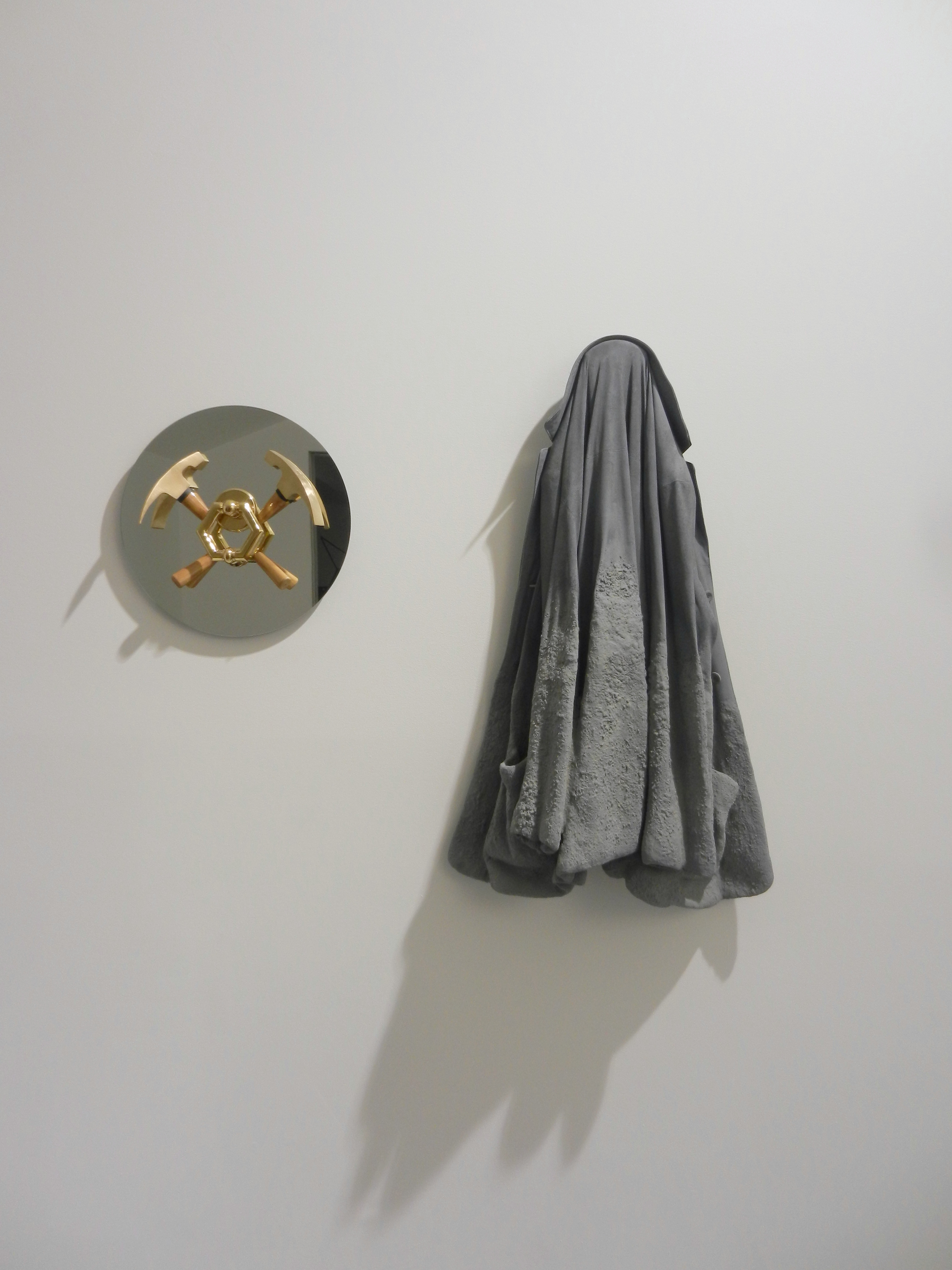 On retrouve cette réflexion dans les oeuvres de Célia Nkala. Pour Bâtir habiter penser – 1, l’artiste a assemblé deux marteaux biseautés et un marteau de porte pour composer l’image de la relation indissociable entre le fait de bâtir et celui d’habiter. La composition évoque ainsi la construction et l’habitat comme relevant du domaine de l’être, référence au texte de Heidegger. Bâtir habiter penser – 2 joue sur la présence d’un possible corps. Une veste en daim partiellement figée suggère que le vêtement est ce qui fonde l’habitat, lieu de protection du corps. L’être s’imprime, se fait objet dans l’espace qu’il habite. Dans cette œuvre en duo, l’objet, élément de l’habitat est relié au corps. Gabriel Jones nous offre, lui, à travers ses photographies un paysage qui fait récit.