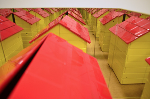 Ensuite, vient l’habiter proprement dit. Les artistes s’interrogent sur nos relations au lieu. Sandra Aubry et Sébastien Bourg travaillent sur ce qu’ils nomment un espace transitionnel. Dans leurs collages, des éléments sont insérés dans le dessin d’une pièce d’une maison et construisent des espaces insolites. Au sol, dans Macro-monde d’Émilie Benoist, du fragment de matières naît un paysage. Peu à peu, nous rentrons dans l’intérieur d’espaces étrangement habités. Carlos Reyes intervient in situ dans une salle étroite, en longueur : un passage où sont installés des caissettes transformées, telles des excroissances architecturales.