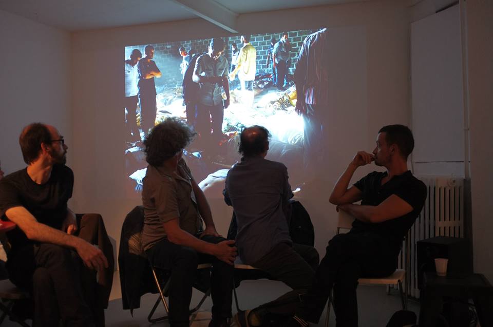 Des tables déposées ponctuent l’espace Khiasma. Dessus, transparaissent des photos du conflit en Syrie, tirées de l’AFP, plastifiées. Cela ressemble à un hangar à syntaxe, assis cul de plomb au milieu de débris d’un bombardement médiatique. Des tas de mots, arrachés sur le vif, s’accrochent à une photographie piochée au hasard entre horreur et cruauté. Le samedi 25 septembre, La table des opérations, dont le sous titre est Protocole partagé, se donne à lire sous la forme d’un essai poétique d’investigations en cours d’écriture. L’auteur de ce geste est Frank Smith. Le dispositif de cette lecture élémentaire répète le processus d’extraction d’un document. Les spectateurs sont répartis autour de tables, par petit groupe. Au fil d’images et de sons, ils se font acteurs. Les règles et la distanciation à l’œuvre dans cette lecture ont été inspirées par l’« ABC de la guerre » de Bertolt Brecht.