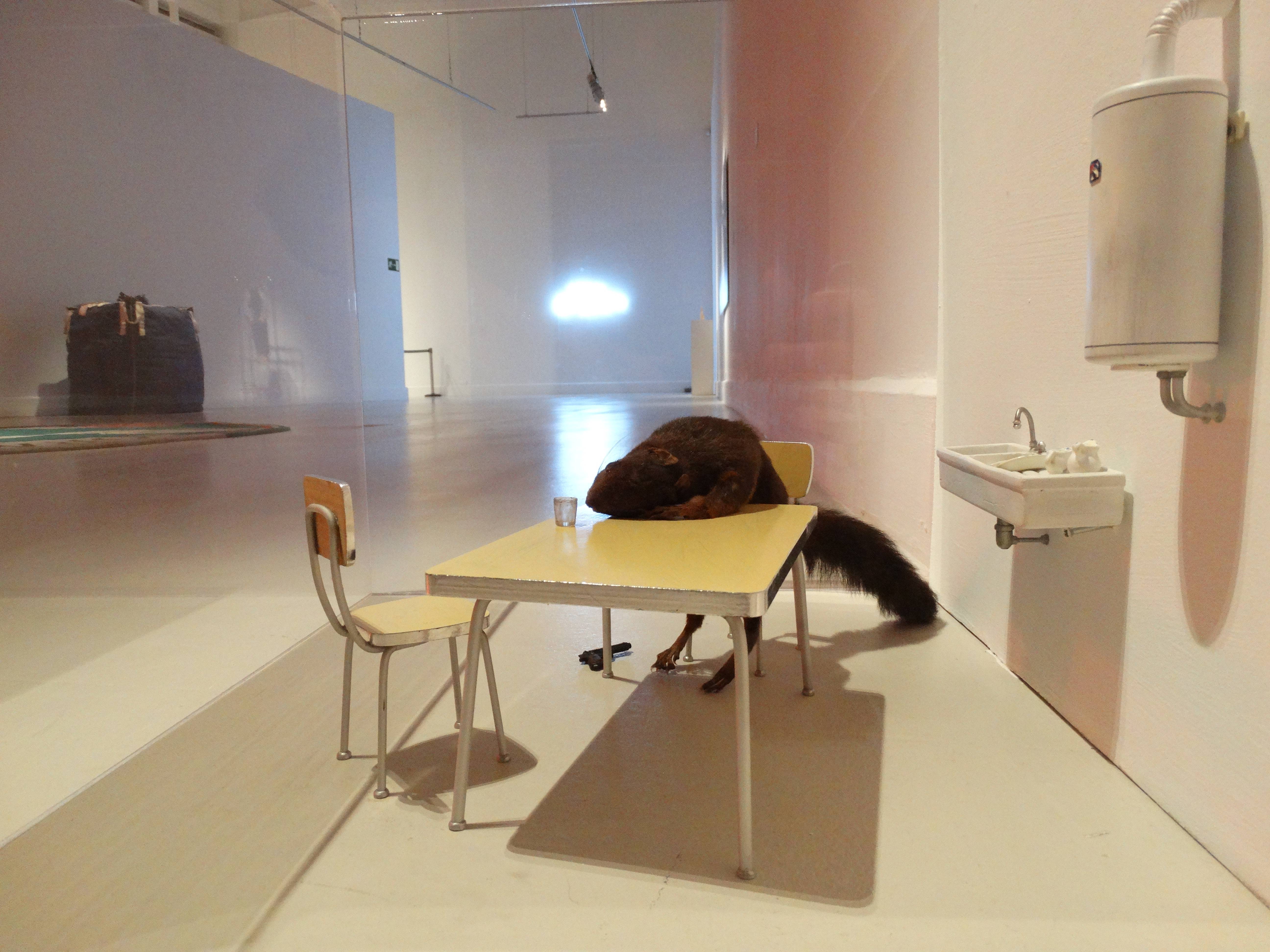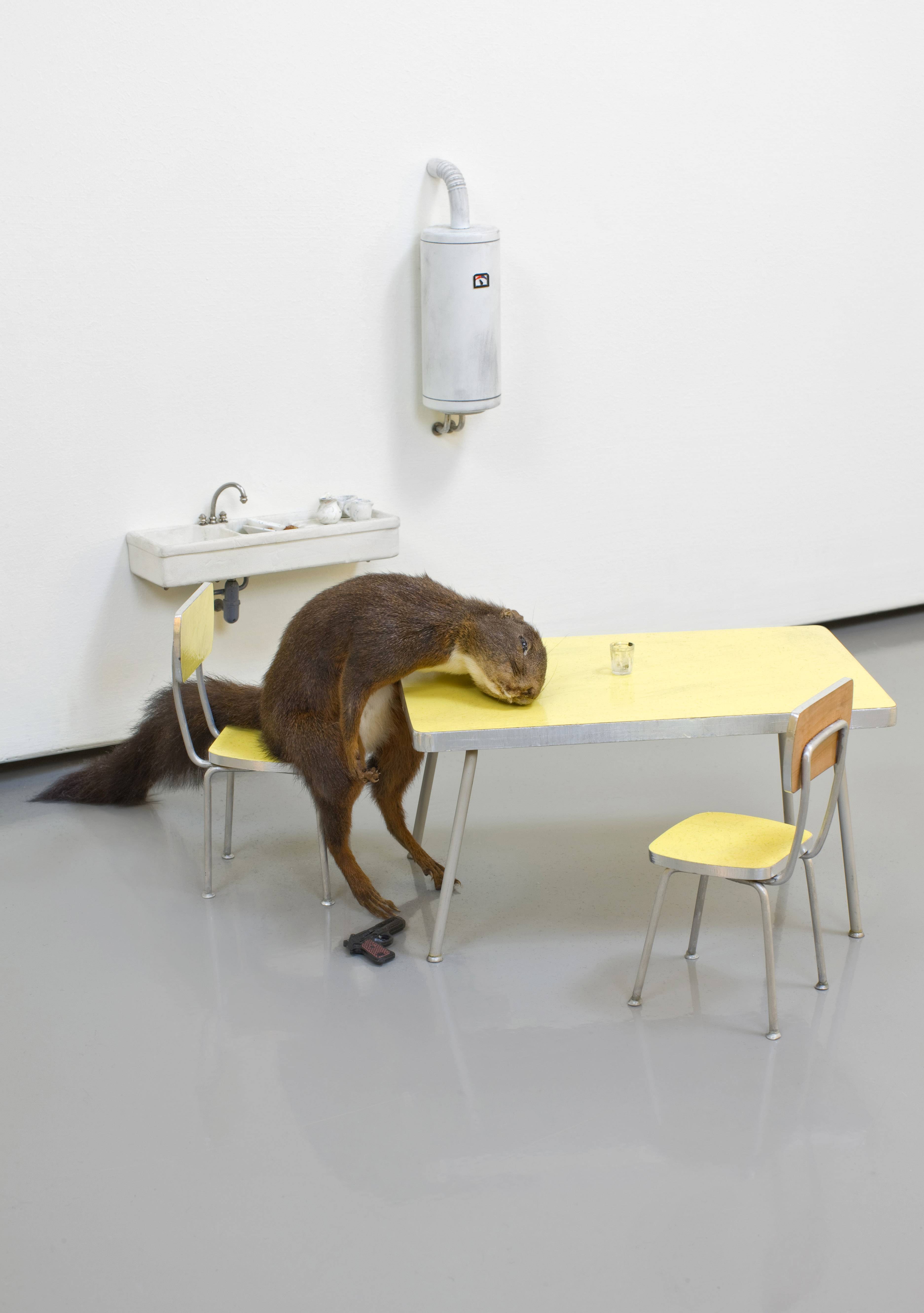 Biographical elements are evident in the installation Bidibidobidiboo (1996), which features a stuffed squirrel that has just committed suicide and has collapsed prostrate across a table. The furniture in the work refers to the house that Cattelan grew up in Padua and which he left as soon as he was eighteen. The animal’s suicide represents the existential crisis of the transition from adolescence to adulthood, evoking the melancholy and sadness involved in leaving behind other facets of life.