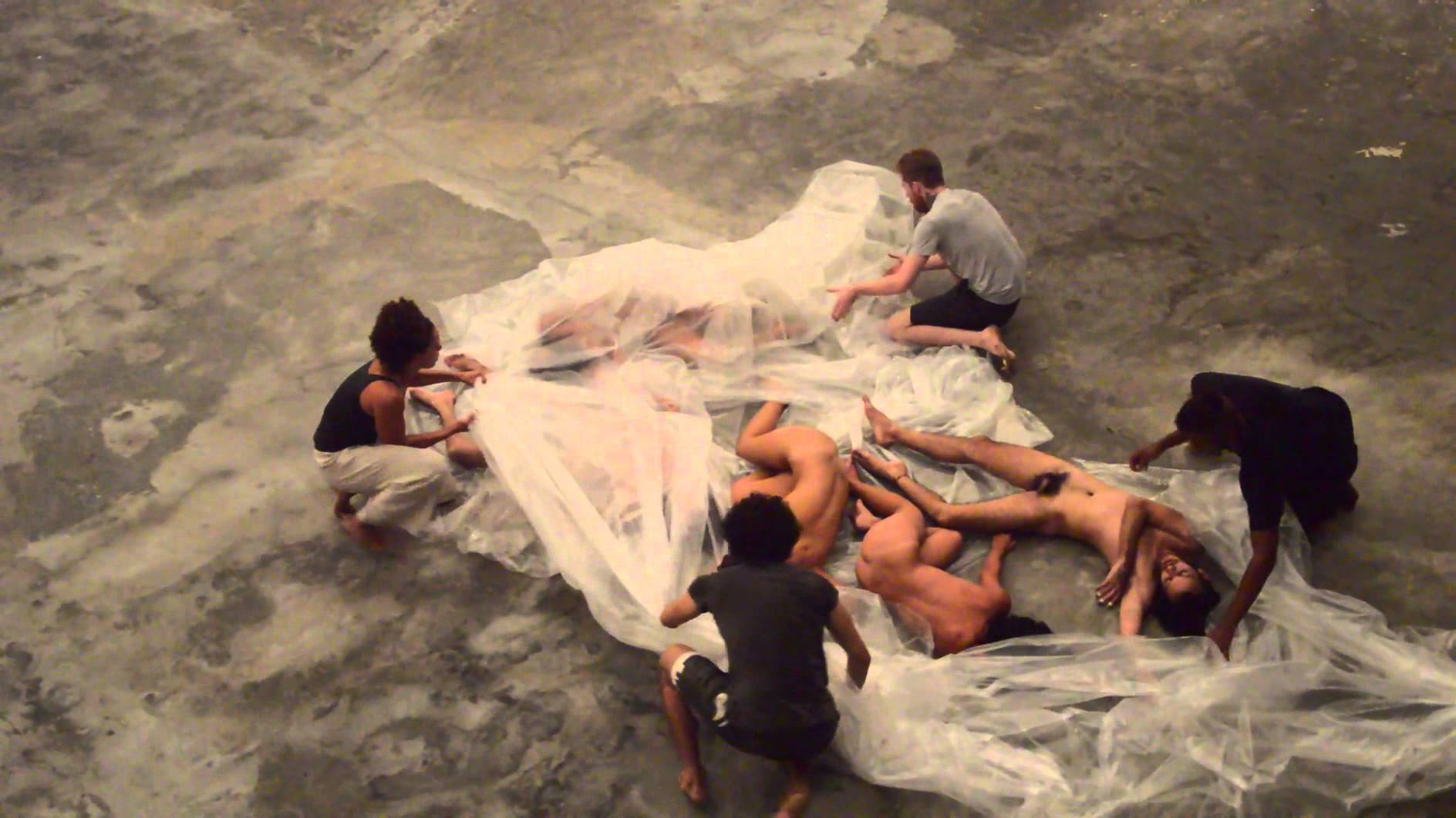 Un plateau nu. Des spectateurs, assis ou debout, prenant place autour. Une bâche de plastique translucide, posée et dépliée sur toute la longueur de la scène. Décor minimaliste pour une vague aux humeurs changeantes, se faisant tantôt houle discrète, tantôt déferlante, et agitant les corps mis à nu des onze jeunes danseurs et danseuses devant trouver là, dans leur propre énergie et dans celle des autres corps sur lesquels ils viendront s’appuyer, les ressources pour exister, ensemble ou/et séparément, dans la tourmente.