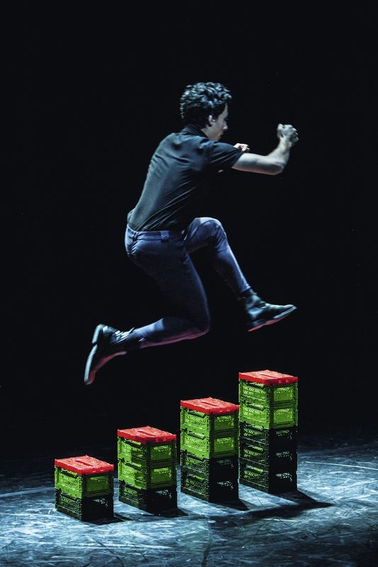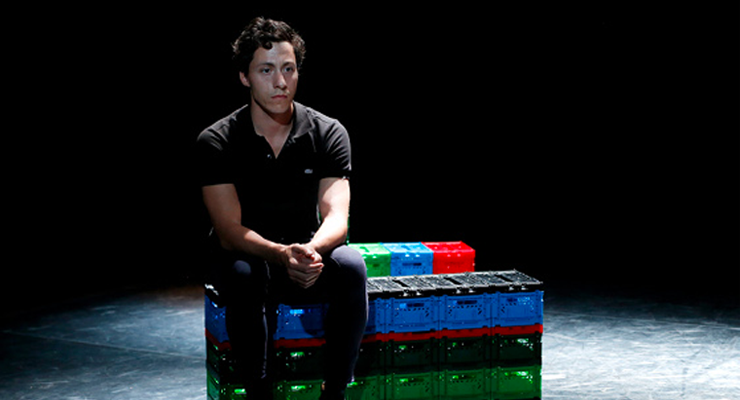Le plateau de l’Atelier de Paris prend des allures d’installation d’art contemporain. Des structures colorées, modulables, y dessinent des géométries minimalistes qui attendent d’être activées. Les mini-cagettes qui les composent s’empilent parfois de manière vertigineuse, comme autant de tiroirs d’une construction mentale qui va dévoiler petit à petit quelques uns de ses secrets. Médail décor puise ses matières dans les zones troubles de l’enfance, au moment où les frontières entre la réalité et la fiction commencent à se préciser, tout en gardant une certaine porosité. Dans le puzzle qui prend forme sous nos yeux, les pièces manquantes sont tout aussi importantes que celles que l’on nous montre. Vincent Thomasset cultive l’art ténu du hors-champ : par le biais du texte, du geste, des intonations, d’autres espaces, d’autres temporalités s’invitent sur le plateau. L’écart, l’équilibre fragile, toujours sur le point de péricliter, la danse en tension avec le théâtre, sont autant de tropes de la figure du double autour de laquelle la pièce semble s’articuler.