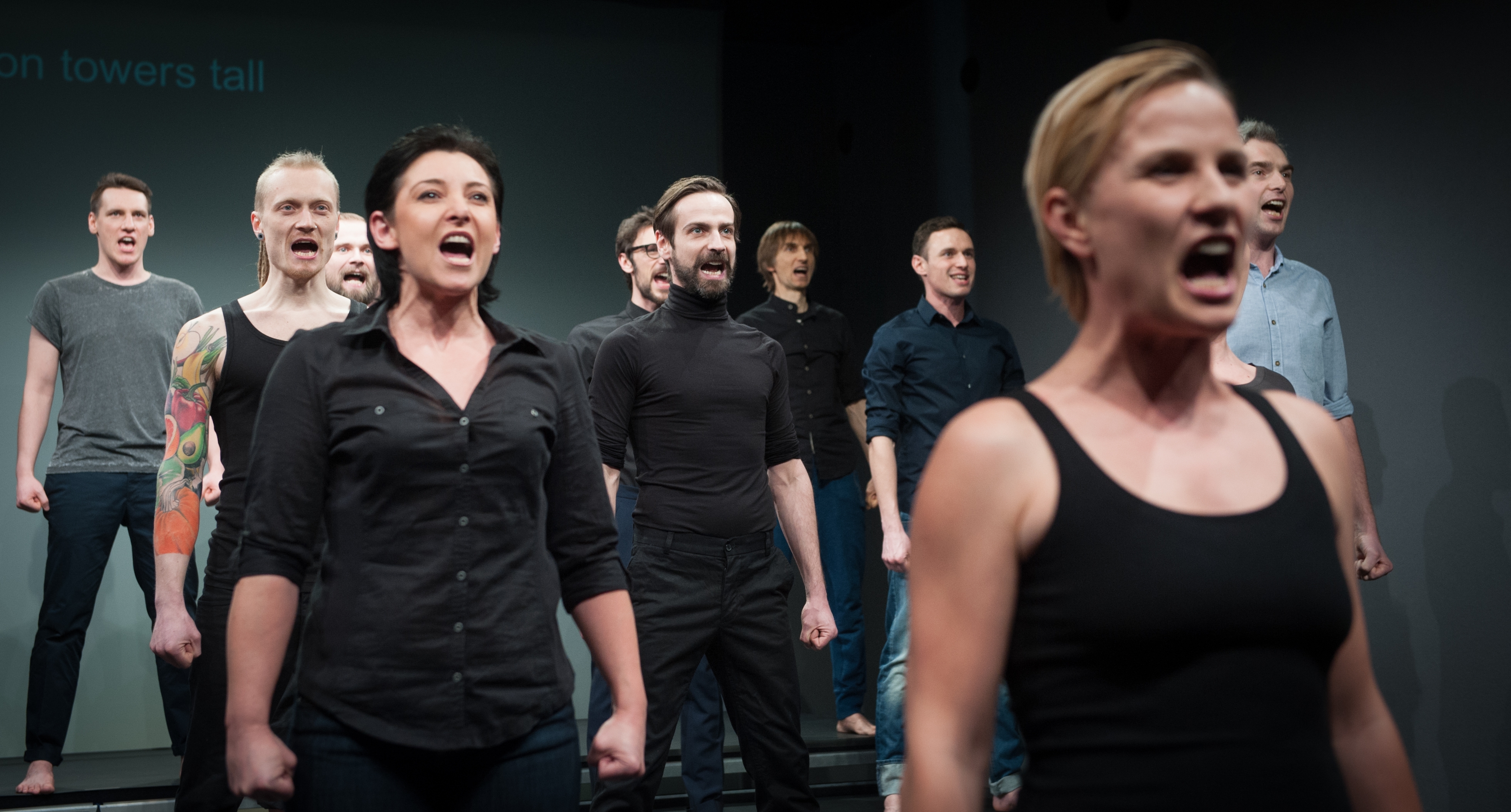 Bouches grandes ouvertes, fronts plissés, les yeux fichés dans les yeux du spectateur, chaque interprète est une arme de combat – revolver et bouclier – qui déverse sur scène une langue abrupte tout droit sortie des aciéries de l’ancien Bloc Soviétique. Ce groupe nous rappelle la fonction du chœur antique, entre catharsis et puissance tragique. Il figure aussi les dérives totalitaires dont l’humain est capable lorsqu’il s’agit de dominer l’homme à travers des systèmes de déshumanisation complexes et manipulateurs.