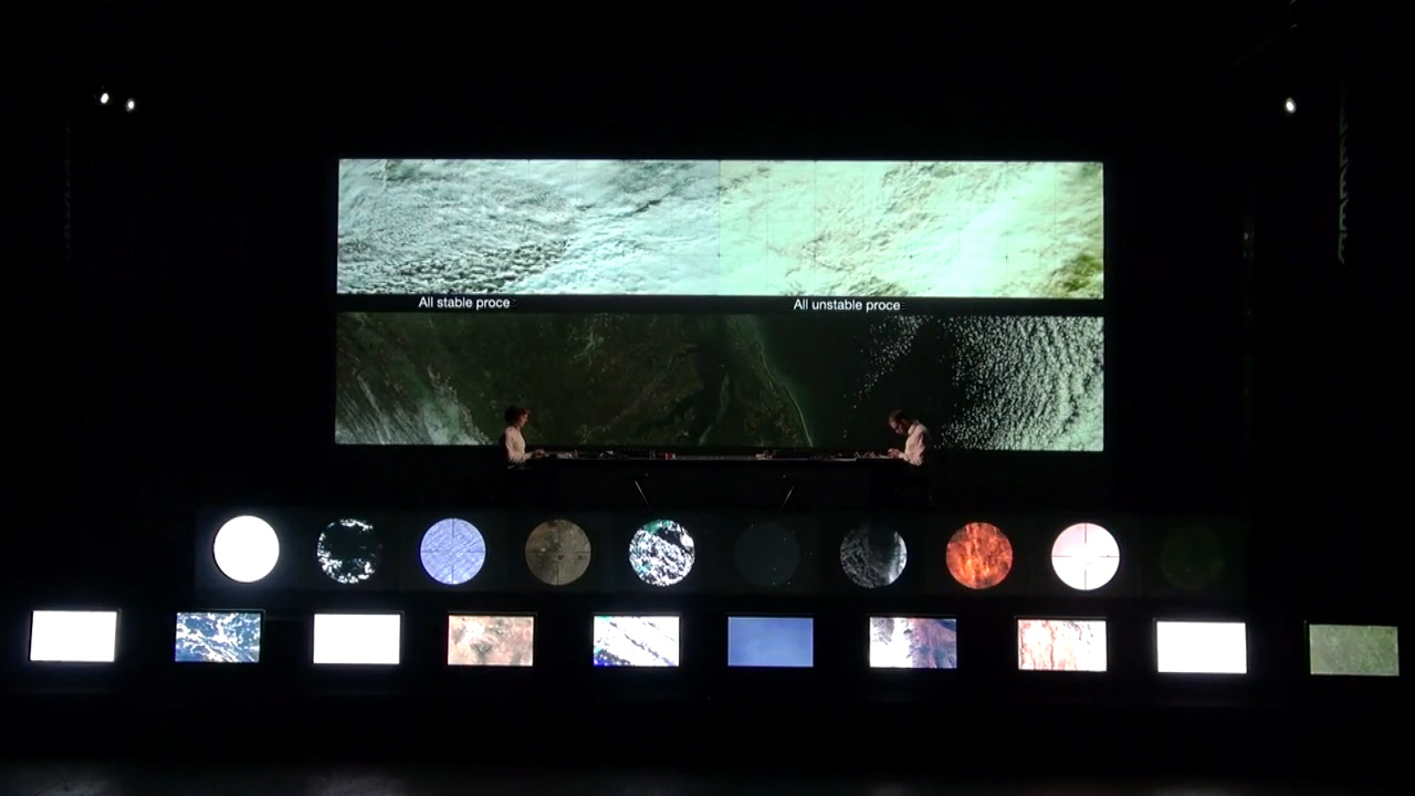 Les deux acteurs, un homme et une femme, qui se trouvent abstraits d’un lieu particulier (nous oublions où nous sommes) pour investir le lieu générique, hors du temps de la « digitalité », sont leurs propres metteurs en scène en temps réel, et semblent contrôler dans un jeu de synchronie-disynchronie avec la « bande son » un défilement d’images projetées en split screen derrière eux, et sur deux rangées d‘écrans placés sur ce que l‘on peut appeler avant-scène. Images digitales abstraites avec un sens admirable de ce que la musique classique nomme le contrepoint, lignes de code cryptiques, signes typographiques apparemment arbitraires, ne formant ni mots ni texte, imagerie cérébrale, vues satellitaires de notre planète, vues en direct resserrées sur les mains des opérateurs communicant en code Morse à l’aide d’appareils télégraphiques, visualisation d’ondes sonores comme on peut en voir sur des logiciels de traitement du son digitalisé.