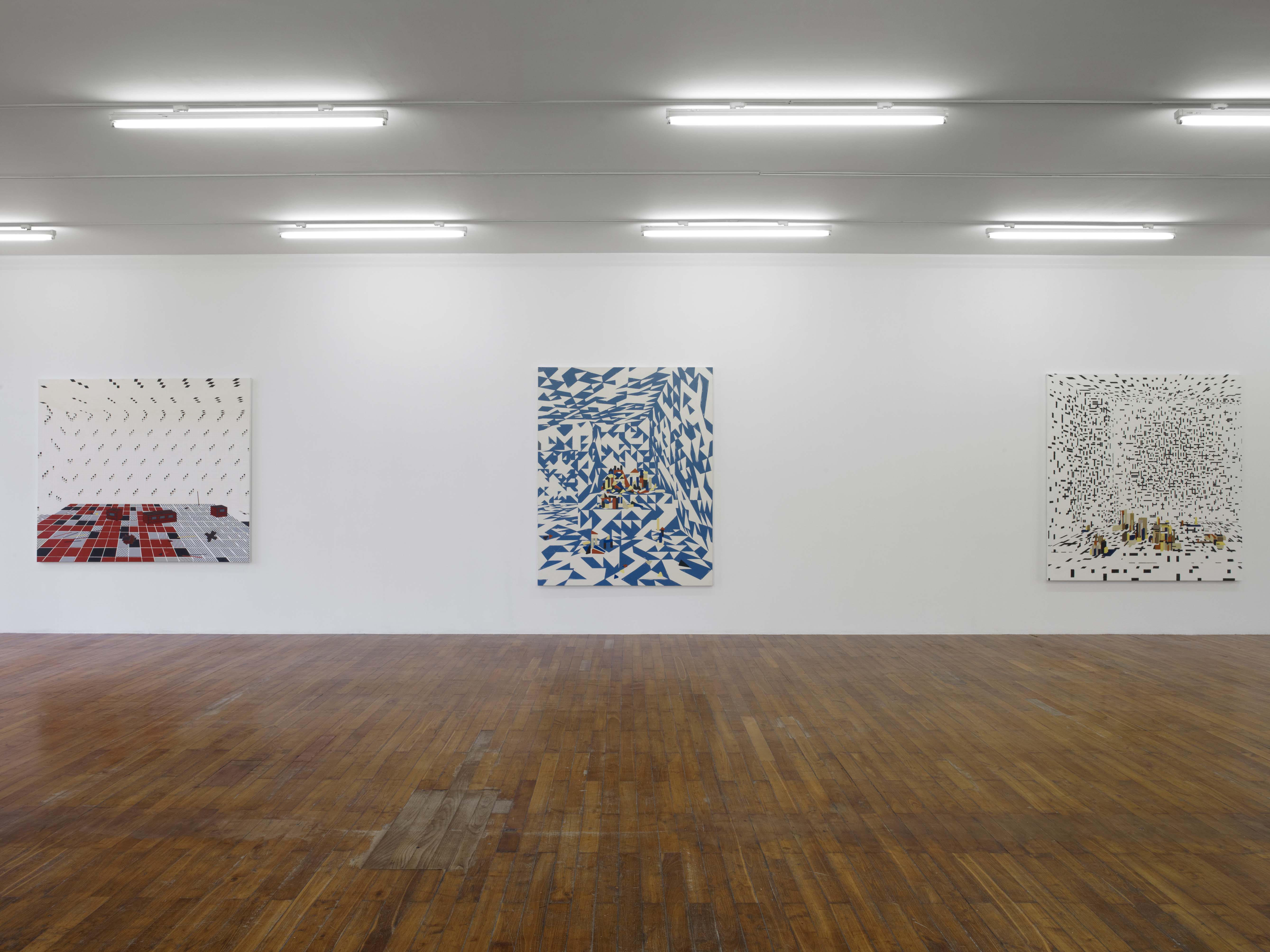 octobre 2014 – janvier 2015 / de gauche à droite : Rec Room, 2012, huile sur toile, Modern toys II, 2013, huile et / glycéro sur toile, Space for objects, 2013, huile et glycero sur toile / © Marc Domage