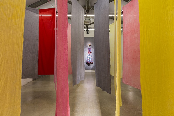 In the following room the viewer is immerged into the wild extravaganza of a site specific installation: large scale multi coloured sheets change completely the perception of the gallery space forcing the viewer to walk through a twisting and labyrinthine route of lights and shadows hiding many twists and numerous surprises.