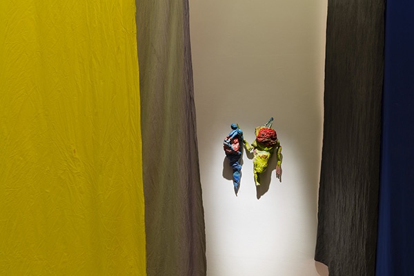 The second room of the gallery is populated by a series of mischievous objects and figures made of papiermachè; these sculptures come from the set of the puppet film Vision Verticale, previously presented at Le Consortium in Dijon for the exhibition “L’Almanach 14.” Light and whimsical, this film casts the scientists of the CNES (Centre National des Etudes Spatiales) on board of a space station in their day to day activities that gets destabilized by a mysterious event: the apparition of a strange terrestrial construction.