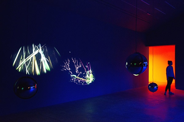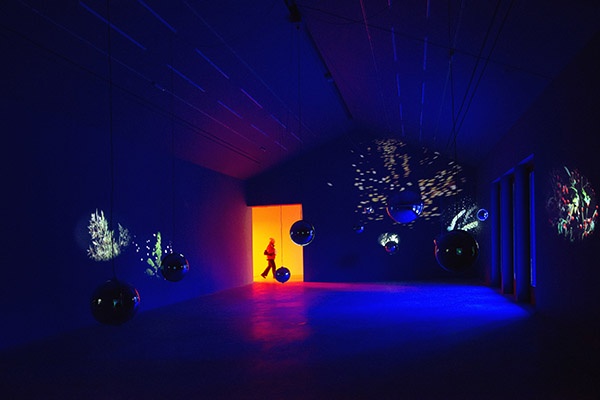 On entering the Bourgeois Gallery, the viewer is immersed in another of Rist’s parallel worlds. The installation Sleeping Pollen (2014) is projected through seven mirrored spheres, suspended from the ceiling, which create moving projections all around the space. Visitors are invited to move in and around the projections, and also to become part of them, reflecting the artist’s continuing desire to create a close relationship between work and viewer. The doors and windows have been covered in translucent acetate in cherry red and moss green, creating a hazy glow that changes in intensity throughout the day. Rist describes Sleeping Pollen as “offering the winter plants an electronic bed in a dark cosy room. Their dreams spin slowly in the air.”