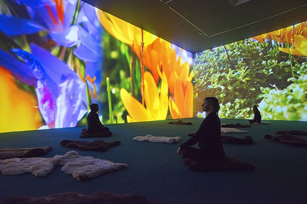 This sumptuous all-encompassing environment is designed for relaxation and meditation; the floor is partially carpeted in lush green with Somerset sheepskin rugs scattered across. Rist encourages her viewers to recline, inviting them to contemplate, and at the same time, to share a collective experience with their fellow spectators.