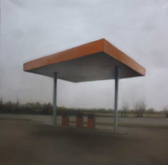 Les plongeoirs, les stations services, les caravanes: la pseudo insignifiance et la plastique de leur forme ont attiré mon regard. C’est le rapport entre ces formes géométriques et leur environnement, l’intégration inexorable et lente de ces masses dans le paysage que j’ai envie d’étudier. Trouver la beauté là où on ne l’attend pas. On me parle de Hopper parfois, mais je ne me sens pas spécialement être proche de lui. Ses compositions sont parfaites et très fortes, mais je trouve que ses personnages sont anecdotiques. Et je ne veux surtout pas aller vers l’anecdotique, au contraire. Pour moi Hopper est plus un peintre de la solitude que du silence.