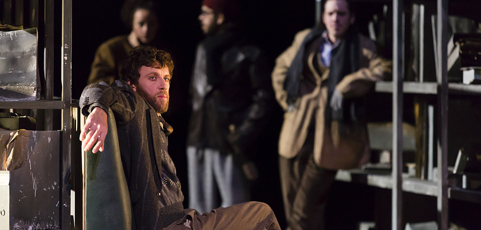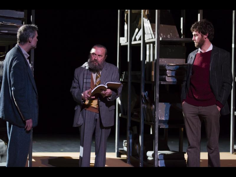 Ces différentes strates (roman, théâtre, philosophie, histoire ; trois époques) qui se recouvrent les unes les autres, sont présentées dans un décor dont la sobriété à la Hopper le dispute à la rigueur d’évocation : des panneaux coulissants permettent de circuler entre deux lieux (la chambre de B. et la maison d’édition) et libèrent un canapé et d’immenses étagères métalliques – remplies de dossiers manuscrits et de livres – symbolisant tout autant la culture de l’écrit menacé par l’holocauste que les châlits des tristes dortoirs où s’entassaient les prisonniers réduits à leur numéro tatoué et à leur tenue rayée.