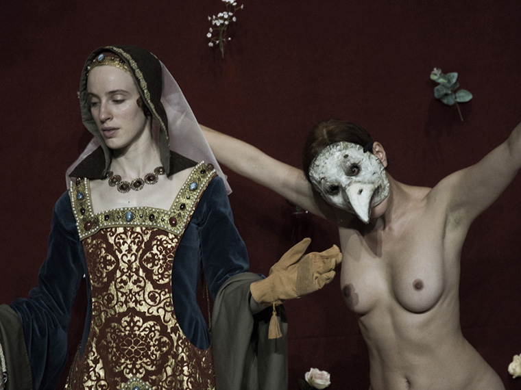 Dans l’entrelacs des formes et du récit que Gaëlle Bouges tisse sur la scène, point une menace sourde. Celle du déchirement du voile de la dame sensément vierge, ou celle du retournement du monde, sage et chaste, qui nous apparaît avec une évidence trompeuse. Or, la Dame a des yeux licencieux et l’on devine son derrière lors qu’elle se tourne car sa robe n’est pas fermée. Trente-cinq lapins agitent la scène champêtre de leurs sauts lubriques et l’on se demande dès lors si la licorne est là pour attester de la chasteté de la belle ou plutôt pour lui servir de paravent.
