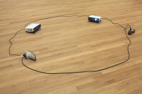 Image : Paul Chan : Sock N Tease, 2013 / Concrete, cord, shoes, and video projectors, with digital color video, silent, 10.2 x 358.1 x 229.9 cm overall / Courtesy the artist and Greene Naftali, New York / © Paul Chan. Photo: Tom Bisig, Basel