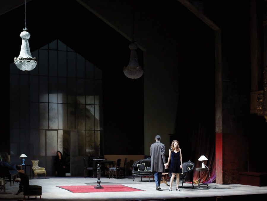 Le plateau mime une architecture étudiée. Les décors ouvrent de grands espaces où tous les personnages se retrouvent, dessinent des lignes de fuite, comme ces tringles mobiles qui s’écartent harmonieusement selon les circonstances. Cependant, la structure ne peut se substituer à la profondeur. Or, le tête-à-tête sublime entre père et fille sur la question du mariage de cette dernière est noyé dans ce format trop large.