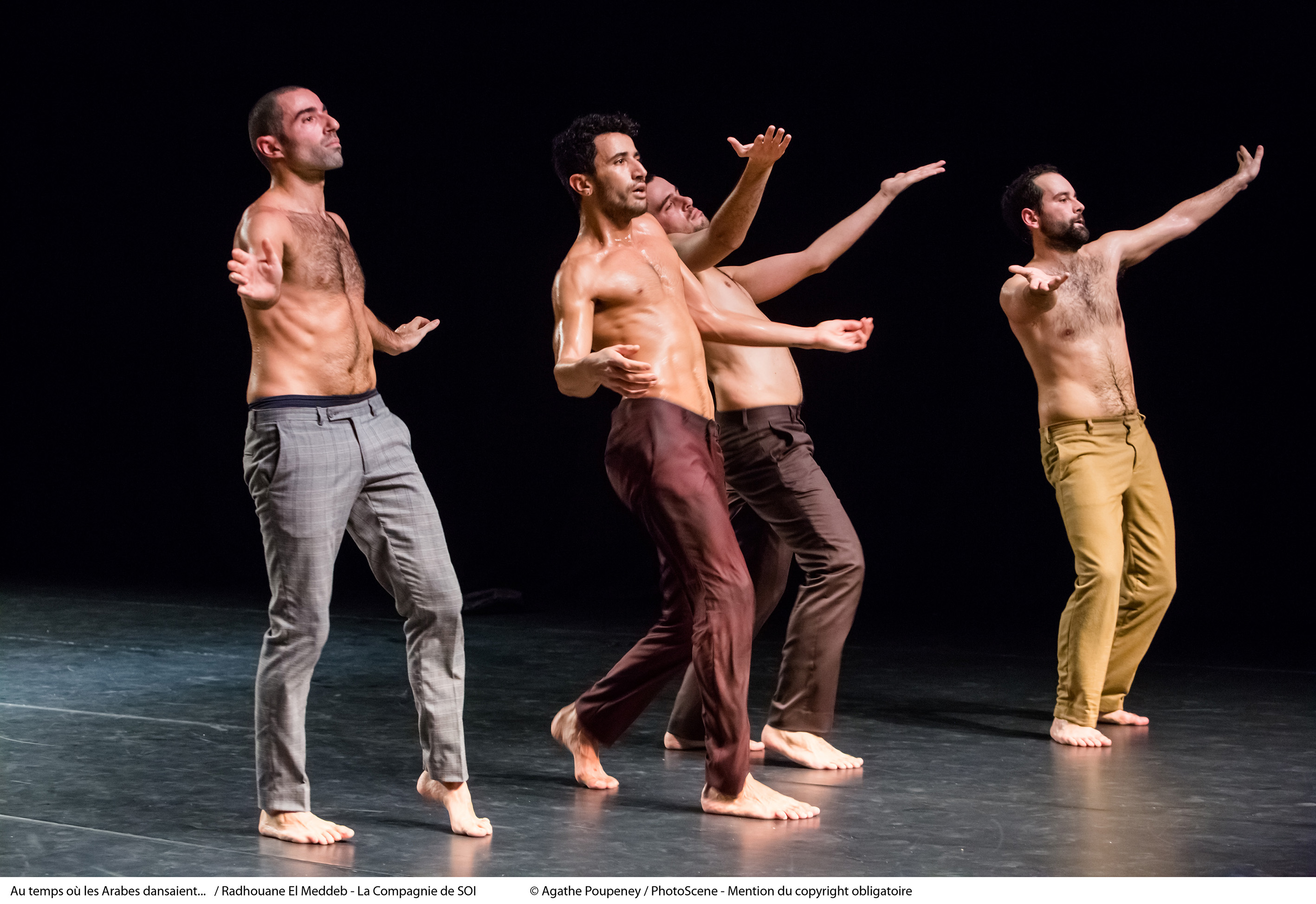 Les hommes ne sont pas sensés avoir la même mobilité du bassin que les femmes, cependant, dans « Au temps où les arabes dansaient… », les bassins de ces quatre hommes sont mouvants. La mise en scène est très écrite, les mouvements des corps se font de plus en plus expansifs, à l’opposé de ce qu’ils sont au début où, progressivement, les pieds commencent à bouger, puis les jambes et enfin le bassin. Au fur et à mesure de la pièce, les danseurs s’approprient de plus en plus cette danse et s’expriment par elle.