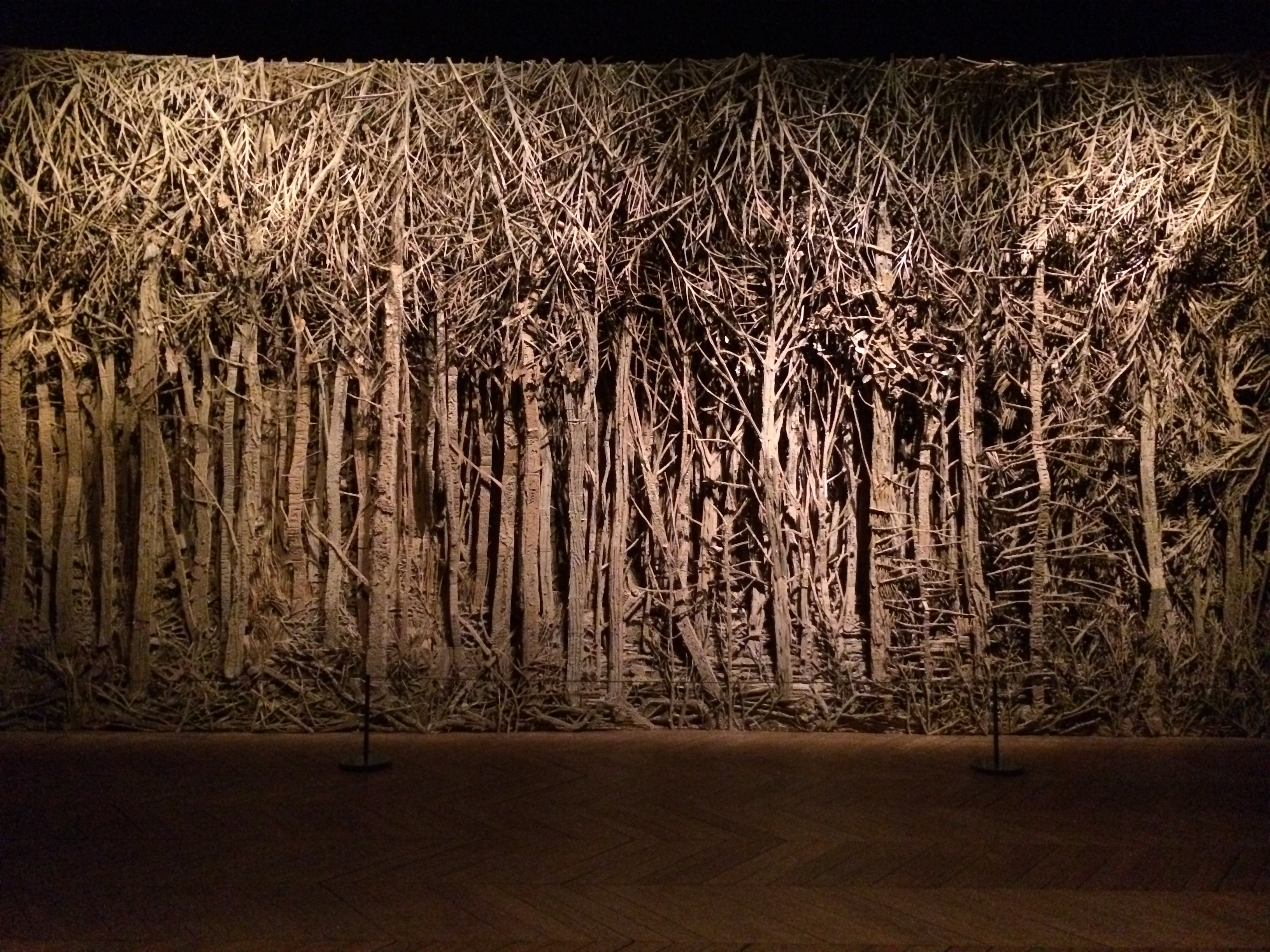L’exposition présente en préambule la Forêt intégralement composée de carton d’Éva Jospin. La très grande densité des branchages forme un haut-relief qui invite autant à la confrontation qu’au franchissement, comme un interdit qui se brave, alors qu’une atmosphère colorée de mystères et de recoins obscurs figure un monde inquiétant, propice aux découvertes heureuses aussi bien qu’aux rencontres surnaturelles. Le spectateur se positionne en aventurier, en itinérant destiné à surmonter des obstacles, à l’image des dalles mouvantes de Charlotte Charbonnel ou des baskets enchâssées sur des morceaux de pneus de Chloé Dugit-Gros, œuvre résonnant avec les souliers fabuleux que l’on retrouve dans les imaginaires fantastiques en étant affublés de pouvoirs magiques. Par la suite, ces appels au voyage sont l’occasion de rencontres étonnantes avec des êtres étranges, reflets des forces naturelles ou des vicissitudes bienveillantes du destin. La biche constellée de Julien Salaud, majestueuse, fait écho aux silhouettes irréelles de Chloé Poizat, tandis que retentit le lumineux croissant de lune de Laurent Pernot, inexplicablement prisonnier d’une cage d’oiseau, ou la phrase mystérieuse de Jean-Baptise Caron qui dans un souffle, se dessine sur un morceau de cristal noir.