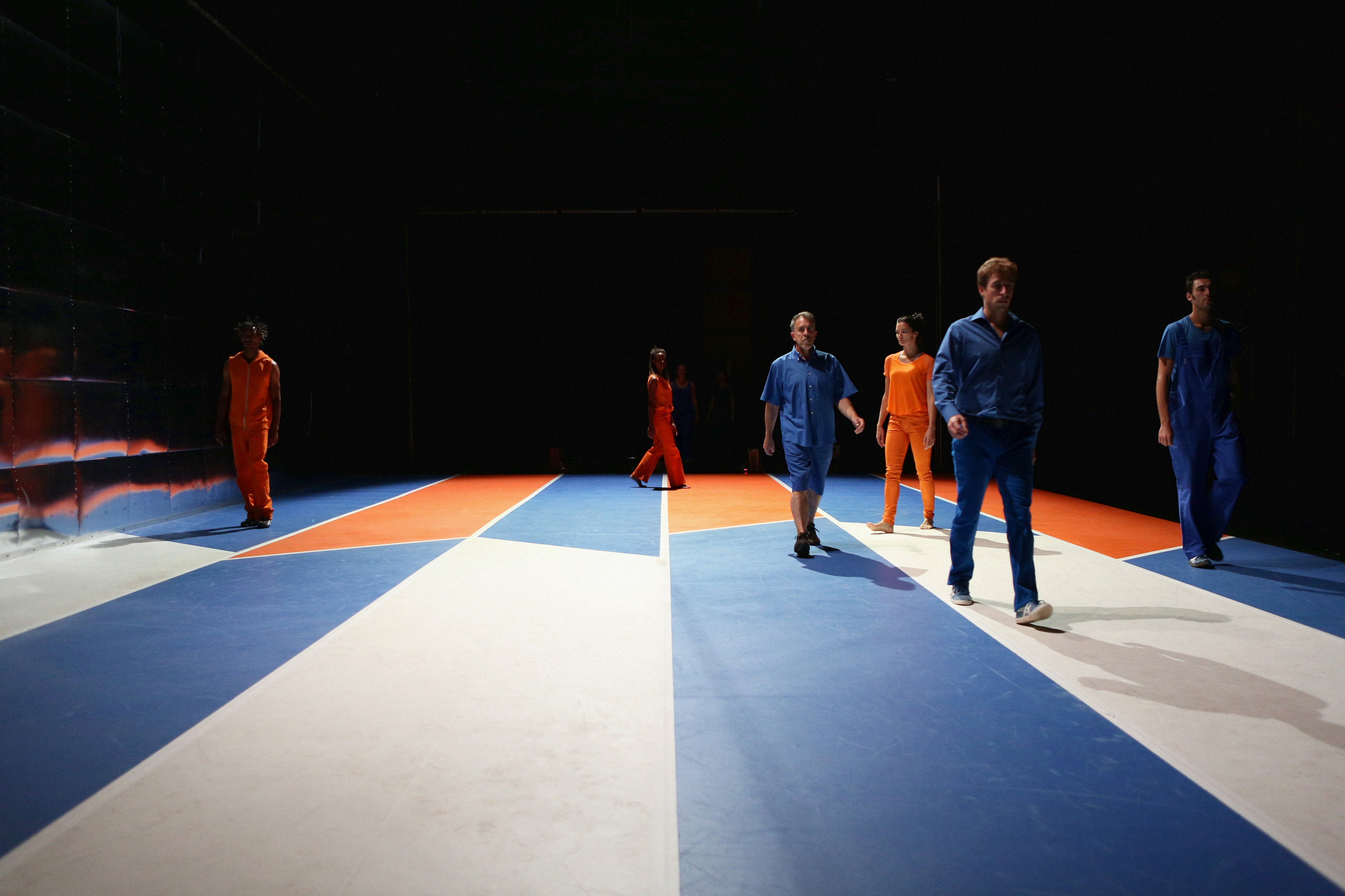Des marques bleues et orange sur le sol. Le même bleu et le même orange que les costumes que portent les interprètes de la pièce – professionnels, habitants et enfants choristes – et qui les divisent en deux groupes distincts. Le bleu de la police et de la République ; l’orange des prisonniers et des bannis. Au fond, une paroi argentée reflètent la lumière comme une lune qui révèle ce que dans la nuit noire on ne voit pas.