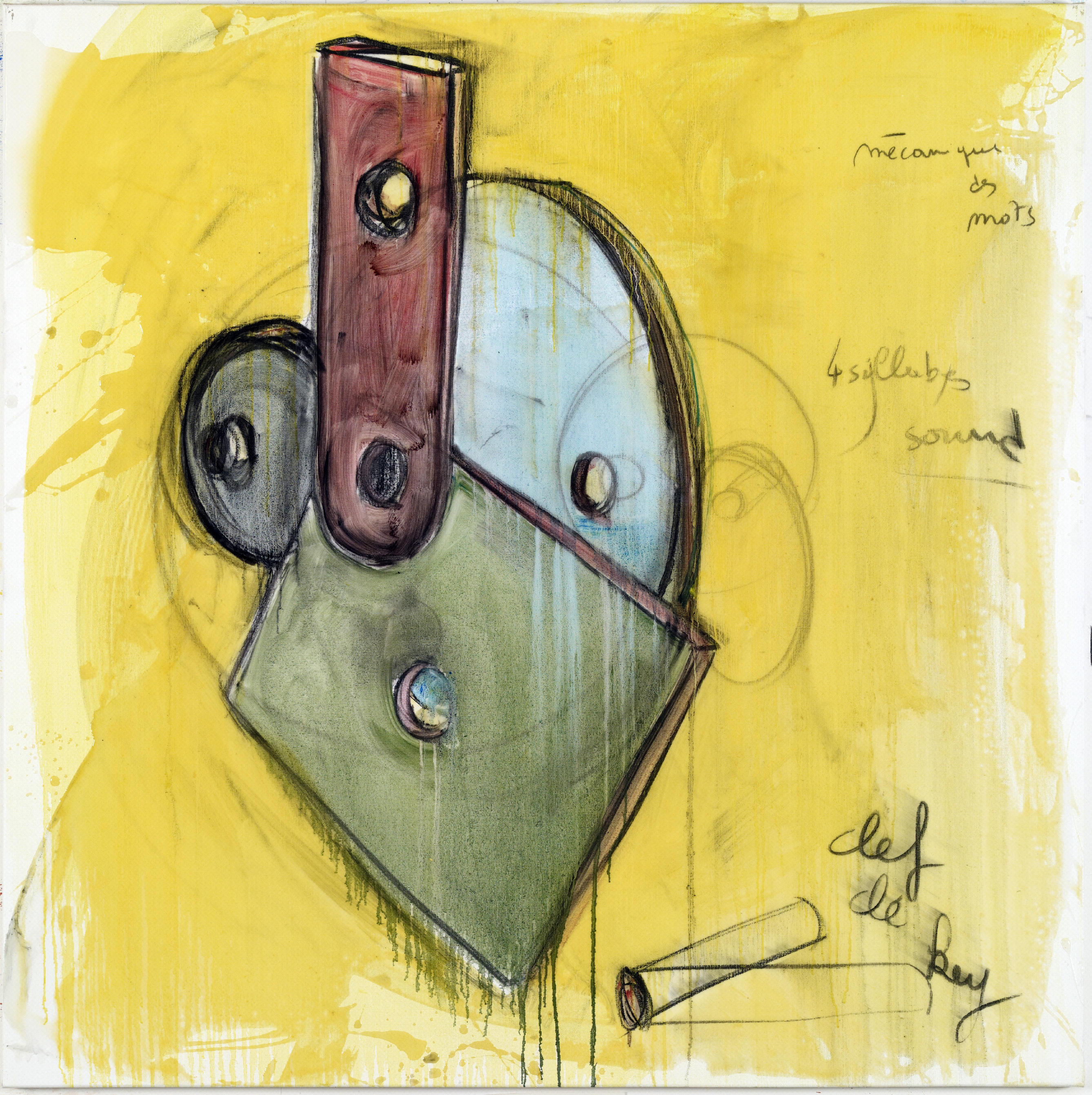 Fabrice Hyber jongle avec les mots comme avec les couleurs. Le langage plastique qu’il développe dans la série de peintures inédites exposées au M HKA allie jeux graphiques et jeux phoniques. À ce titre, le tableau Clés de mots est exemplaire. Les rouages d’un engrenage représentent chacun une syllabe à laquelle est attribuée une forme et une couleur spécifique. Le dispositif est prévu pour fabriquer des mots clés ou des clés de mots, selon le mouvement donné à la machine. L’artiste dévoile ici le schéma d’un nouveau POF – Prototype d’Objet Fonctionnel – dont le mécanisme repose sur le langage écrit et parlé.