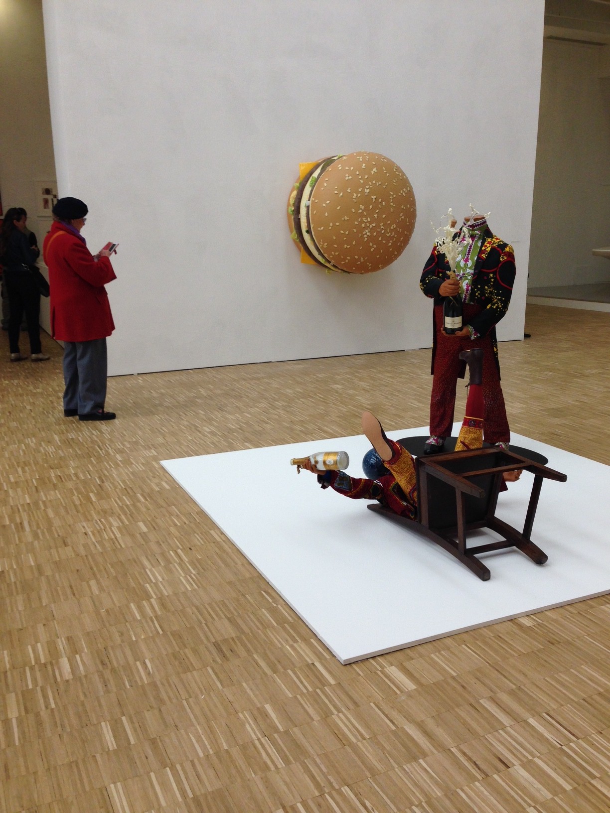 Les contemporains américains comme Jeff Koons, ici avec deux tableaux hyperréalistes de gâteaux très colorés et appétissants, ont largement tendance à continuer dans la lancée Pop des agrandissements, et de produits surtout alimentaires mais décidément plus «culture de masse», comme le Big Big Mac de Tom Friedman et le McDonald’s de Tom Sachs dans le foyer du musée. Le dernier mot – mais toujours dans le style Néo-Pop – est laissé au chouchou italien Maurizio Cattelan qui clôt l’exposition avec son énorme tapis rond en forme de boîte de fromage Galbani.