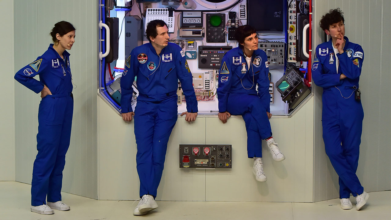 A travers une plongée vertigineuse dans le temps – les années défilent à une vitesse sonique alors que les dates et les secondes s’égrènent à fond la caisse sur une horloge en fond de scène – nous voyons ces missionnaires se débatte entre leur sens moral et la réalité de leur ennui. Ils nous montrent l’évolution une mini-société en vase-clos. Totalement détachés de leurs racines historiques en vue d’une rencontre du troisième type, ils réinventent, à travers différentes péripéties, une toute autre interprétation de leur tâche.