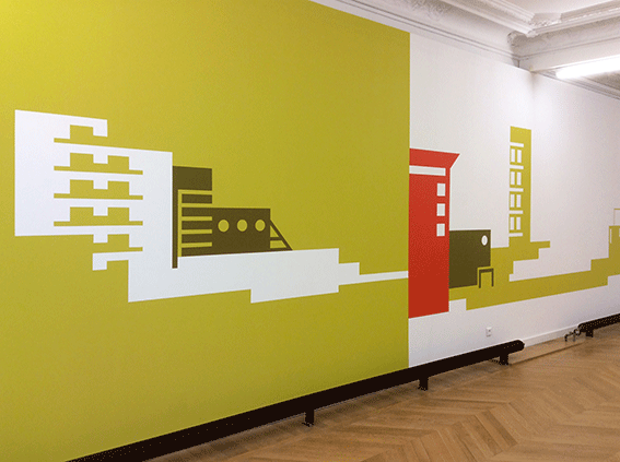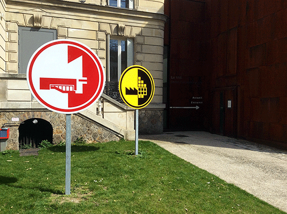 Promenons-nous dans les Wood. On y passe à travers des forêts de symboles dont les paroles ne sont pas confuses, au contraire. Tout est là, étalé sur les murs, et aussi sur le sol. On ne se perdra pas. Avec l’expo « Production Site », on vient au 116, le centre d’art de Montreuil, pour voir les bâtiments qui peuplent Montreuil mais autrement, en wall paintings qui ressemblent à des stickers géants aux couleurs primaires. L’extérieur est à l’intérieur : la ville est résumée à sa signalétique en aplats, un ensemble de panneaux et pictogrammes qui en effacent le vécu ou, plus précisément, le recouvrent. Car les formes en sont épurées, révélées, en quoi Heidi Wood mime la fonction d’un art qui fait supposément du bien par où il passe, en « rédimant » ou « relevant » le réel, en permettant au visiteur de voir son quotidien autrement, plus bio, plus dynamique, de voir la vie en jaune citron et rouge tomate. Mais dans le même temps, le travail de l’artiste est également distancié, puisque l’urbanisme y apparaît comme un ensemble de signes ne renvoyant qu’à eux-mêmes.