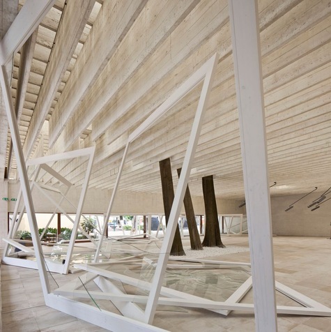 La proposition autrichienne peut paraître ainsi la plus radicale. Heimo Zobering a pleinement investi l’architecture du pavillon construit en 1934. Un monolithe noir semble flotter sous le plafond qui masque les arches voutées et modifie les axes visuels. Une autre construction lui répond au sol qui égalise les différents niveaux du plancher. Il s’agit pour l’artiste de rendre invisible des éléments architecturaux liés à une période historique bien particulière et de poursuivre une réflexion sur les différentes façons d’inscrire la présence humaine dans l’espace. Quant au patio du pavillon, il a été dessiné par les architectes paysagistes Auböck et Karasz. Cet environnement végétal s’inscrit dans la continuité de la Biennale d’architecture de 2014 qui imaginait un rassemblement d’arbres de différentes essences, Gathering of the Trees.