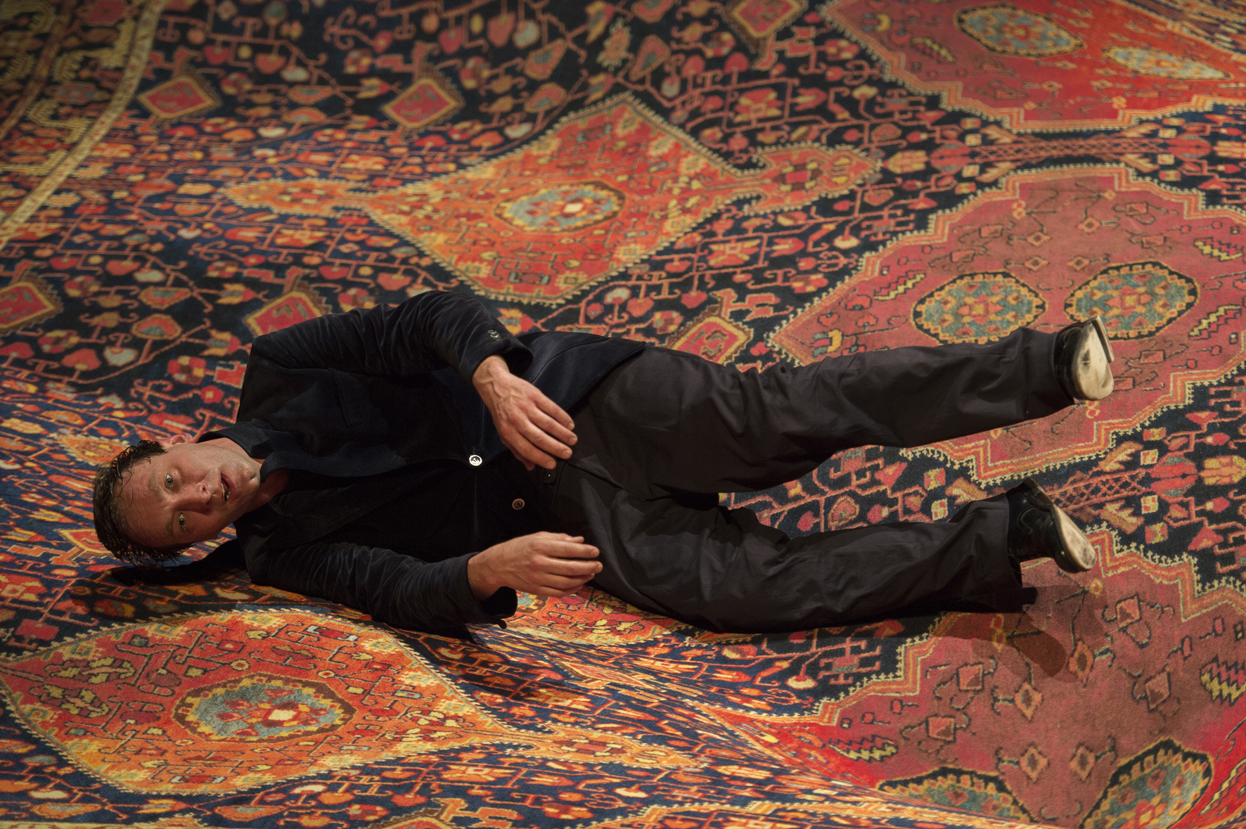 Puis cela continue. On rit de voir ce personnage muet se prendre les pieds dans le tapis, suivre les méandres de ses cimes imaginaires, prendre ses motifs géométriques comme prétextes pour s’adonner à des jeux d’enfants. En fait, ce tapis est une géographie scénographique que le personnage emprunte par des chemins fantasmés, avec maladresse et ingénuité. On sent que son corps l’encombre presque, comme un jeune adolescent qui ne sait plus quoi faire de son ombre alors qu’il prend vingt centimètres d’un coup.
