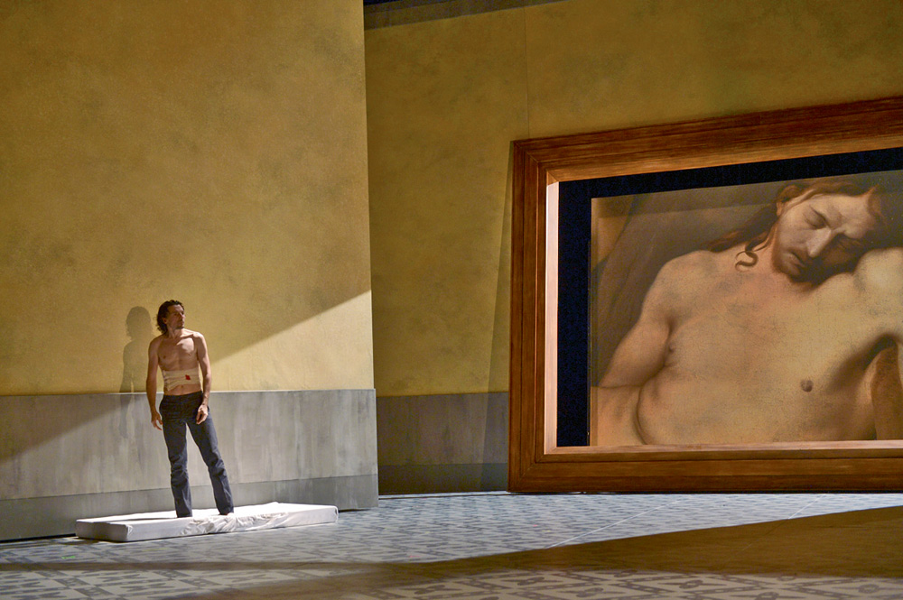La mise en scène de Nordey transpose les vagues à l’âme du père sur le plateau. Défilent alors sur scène des ombres antiques kitch, une voyante absurde engoncée dans une robe cheap tandis que sont installés en toile de fond des tableaux de maître représentant Isaac et Jésus : deux fils universels et sacrifiés. De même, le mouvement des grands panneaux sur scène, qui se dilatent puis se rétractent, comme un le battement d’un cœur, enceignent les personnages devenus minuscules, presque rien, face au décor monumental. L’histoire glisse, au fil de la pièce, d’un drame familial banal à une tragédie, les personnages désormais inféodés à un destin noir qui les broie.