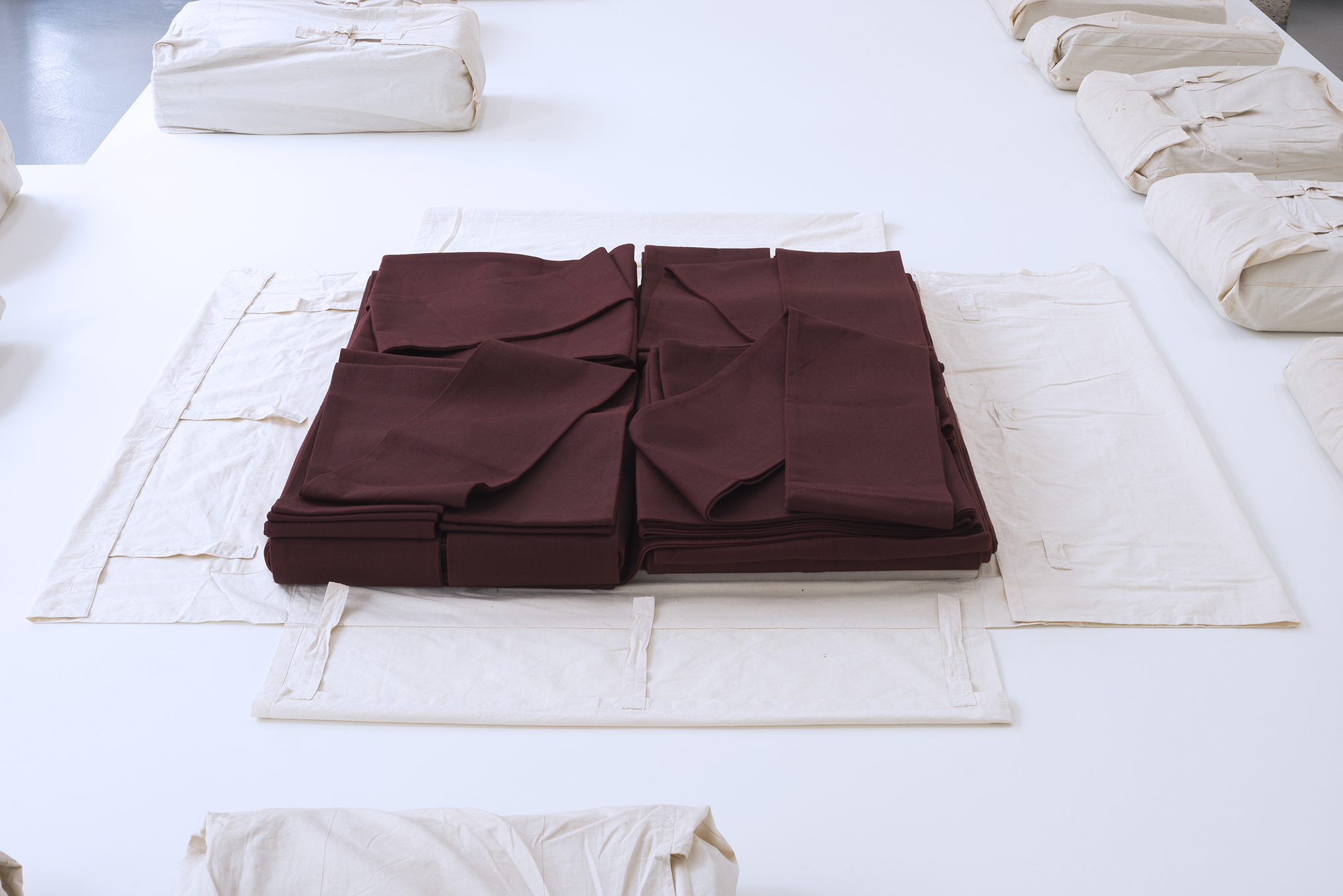Né en 1939, l’artiste allemand Franz Erhard Walther est une figure historique de l’art conceptuel. La galerie Jocelyn Wolff lui consacre une exposition personnelle en ce moment dans laquelle il expose ses célèbres Schreitbahen de 1972 avec en fond sonore l’énonciation des instructions pour la réalisation d’une performance qu’il a réalisé récemment pour la pièce Vier rechte Winkel mit Binnenfeld (Four right angles with enclosed field), Schreitbahn No 33, 1972. Les Schreitbahen sont des pièces découpées selon de grandes figures géométriques en tissu. L’artiste ne les expose que pliées dans des sacs en tissu également. Elles existent avec une grande déclinaison de couleur. Des esquisses montrent comment on peut les « activer », c’est-à-dire comment on peut les utiliser pour une performance. Chacune des pièces à chaque fois différentes sollicite une relation à chaque fois unique avec le temps et l’espace autant extérieur qu’interne. Le travail de Franz Erhard Walther n’a pas changé depuis le début de sa carrière et il a fini par trouver une entière reconnaissance. Son travail est très minimaliste. De nombreuses rétrospectives de son travail ont eu lieu entre 2014 et 2015 au Wiels à Bruxelles, au CAPC à Bordeaux, et au Mudam au Luxembourg. A l’occasion de cette exposition à sa galerie parisienne, Franz Erhard Walther revient sur son travail.