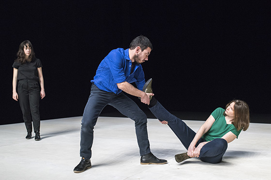 L’espace se charge petit à petit de toutes les potentialités d’une feuille blanche. Tout est écrit jusqu’au moindre sursaut, le mystère n’en demeure pas moins terriblement épais, riche : que se passe-t-il à ce moment précis où une main en attrape une autre ou se dépose lentement sur un visage ? Un changement de paradigme semble à l’œuvre : la danse s’offre à nous comme l’alliage inouï d’une abstraction minimaliste et d’une densité de présence qui rendent le moindre contact potentiellement explosif.