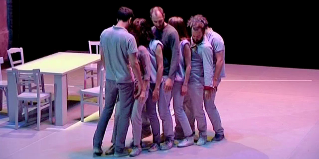 Puis vient la narration, elle est semi-tragique, elle est véhiculée par un micro sur pied et une actrice. L’histoire tente de nous balader tout en douceur à l’intérieur d’une forêt, un peu familière et un peu inquiétante à la fois. Cette forêt est issue d’un conte des origines, des toutes premières fois, quand la matière devient feu, eau, élément naturel. La table de mixage est visible, le bruiteur donne des vibrations en lien direct avec la nature. Les feuilles bruissent et l’eau ruisselle sur scène et donc dans la tête. L’univers est végétatif, il fait apparaître mentalement des rochers, au milieu des aventures mystérieuses et inquiétantes de la vie à plusieurs. Dans ce cocon, les danseurs évoluent calmement presque sur le mode de l’écoulement, de l’abrutissement simple. La psyché flirte subtilement avec l’abstraction. Mais, de l’abstraction à l’hermétisme, il n’existe qu’un pas, un pas bel et bien franchi par la chorégraphie prise au piège par le désespoir d’un geste absolu, parfait, technocratique, mais qui finit, par être vidé de son sens. C’est alors que beaucoup d’interférences langagières interviennent, perturbant la fluidité des déplacements et la narration tourne en rond. La vie éthérée et volatile des danseurs meurt en codes déjà fixés.