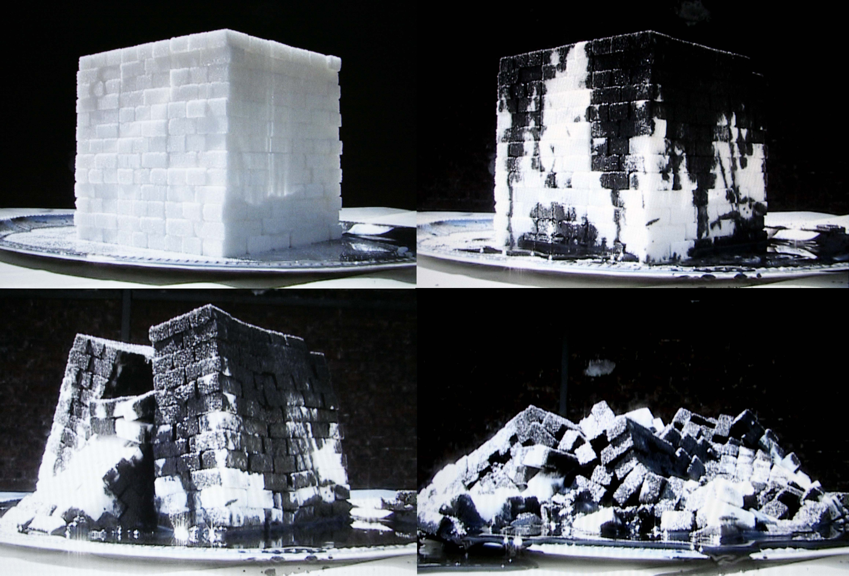La question d’une sur occupation de l’espace se pose d’ailleurs dans d’autres salles de l’exposition comme celle où Oil and Sugar au mur ne dialogue pas vraiment avec Untitled (Couscous) au sol, ceci malgré la cohésion entre le fond et la forme de chacune des deux œuvres. La première montre sur un écran une architecture cubique et blanche, réalisée de morceaux de sucres, qui s’effondre sous l’effet d’une coulée de pétrole. Le cube blanc est à la fois une référence au « white cube », l’emblème de l’architecture moderniste et de la construction cuboïde de la Kaaba vers laquelle se dirige la prière de la Mecque. Les matériaux utilisés symbolisent les échanges économiques et soulignent les liens entre architecture, religion, économie et champ artistique. La deuxième, Untitled (Couscous) au sol montre une vue aérienne de la ville de Ghardaïa sous la forme d’une maquette en couscous. Lorsque l’on sait que Le Corbusier séjourna dans la ville du Magreb cinq semaines en 1933, on prend conscience de la dette contractée par le célèbre architecte moderniste envers certaines architectures traditionnelles d’Afrique du Nord.