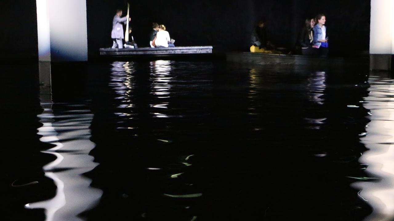 Alors que nous entrons, notre regard est happé par une large étendue d’eau déployée à même le sol et sur laquelle naviguent des barques pleines de curieux aux yeux ébahis. La première impression est celle qui prévaut à l’entrée dans une attraction touristique, tant la queue pour « en faire partie » semble longue. Puis l’on entre dans l’installation à proprement parlé, au sec. On tourne autour du bassin. L’obscurité se fait. Des images aux contours brouillés se baladent sur les murs noirs. L’eau clapote et autour de nous une vague sonore nous enveloppe, comme si nous passions à proximité d’un essaim d’abeilles. Le rythme du cœur s’allège, nos mouvements se font plus lents et l’on cesse peu-à-peu notre babillage badin.