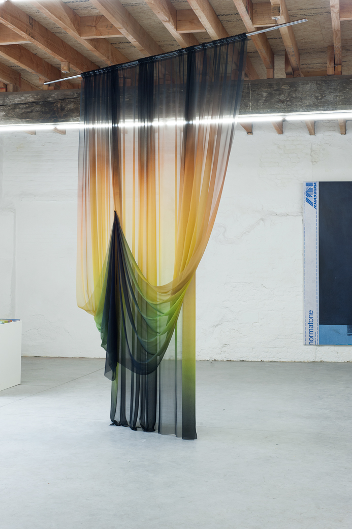 Ces grands morceaux de soie, présentés chacun selon un protocole spécifique, en sont en effet une transcription chromatique, et offrent de ces images souvent caricaturales une vision beaucoup plus sensible et sensuelle, vaporeuse tout en étant extrêmement présente dans l’espace. Si les références des images choisies lors de séries précédentes allaient de la pochette d’un album de Cher aux reflets de la lumière sur la Neva, les différents drapés réalisés pour cette exposition font tous écho d’une manière ou d’une autre à l’industrie cosmétologique, qu’il s’agisse des roses utilisées pour la création d’un parfum – How to drape a rosa gallica officinalis –, des plateformes offshore qui recueillent le pétrole, fragmenté ensuite en naphta –How to drape the ocean that surrounds an offshore Platform – ou bien encore d’une image de Rihanna en couverture du magazine Vogue – How to drape Rihanna’s red hair Vogue cover.