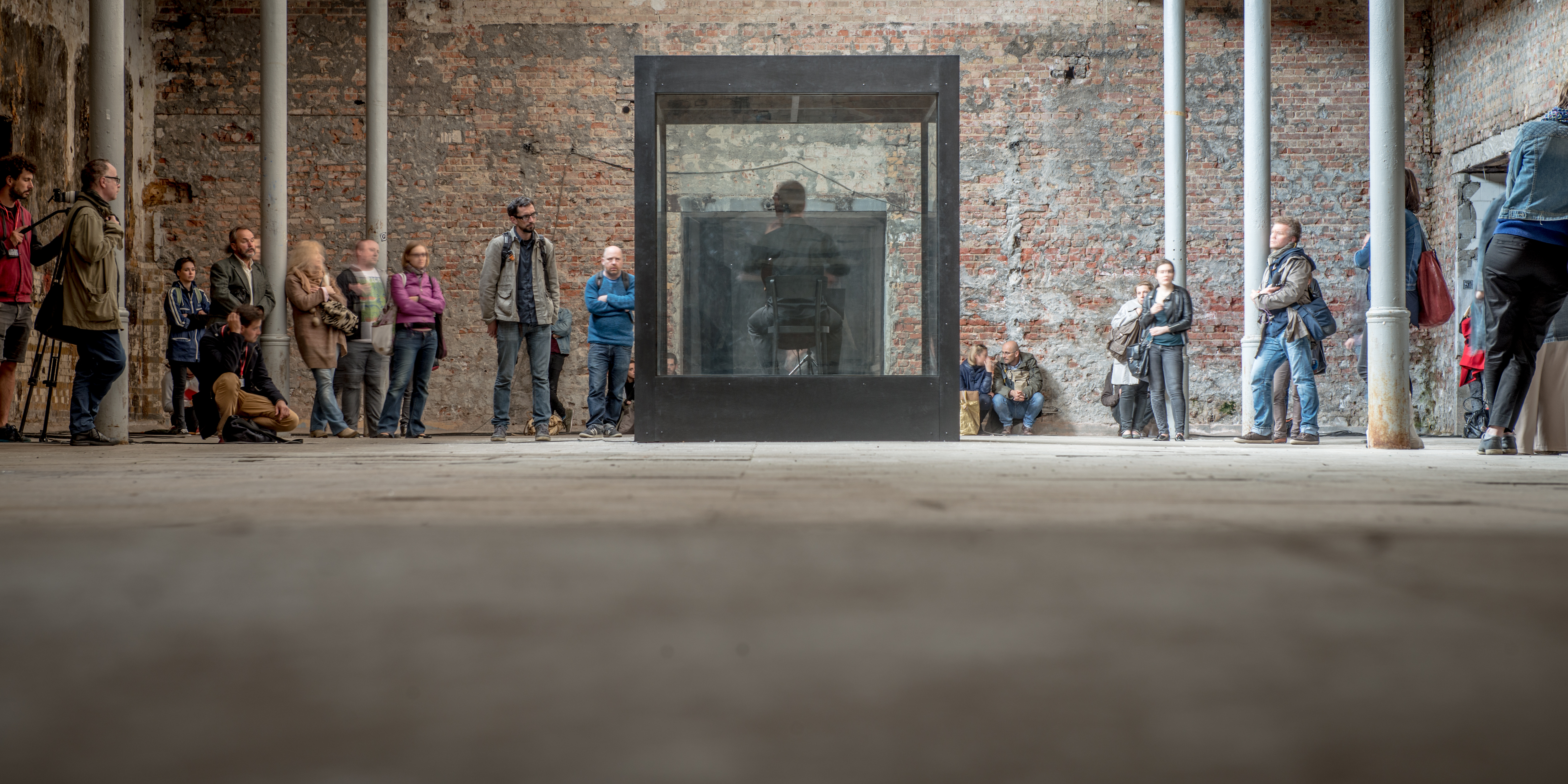 La tonalité de la sonate pour violoncelle seul de Kodály est tantôt lointaine, tantôt proche, selon les déplacements de chacun. Cette sonate résonne en plein centre d’un hangar désaffecté, obscur. Ainsi erre-t-on au sein de ce site polonais à l’égale d’un élément de ballet de poussière représenté à Paris par Romeo Castellucci lors de son Sacre du Printemps de Stravinsky. Mais ici, l’air est frais et humide. Chacun marche silencieusement et arpente pas à pas la partition de Kodály. On déambule plongé, à l’intérieur de cette sonate voyageuse, lumineuse. Le musicien est comme séquestré, placé à l’intérieur d’une boite rectangulaire faite de bois et vitres opaques ou transparentes. Sa partition est rendue lisible à l’aide d’une tablette électronique. Chacun regarde, s’assoit pour l’écouter, la contempler. Cette sonate dévoile l’imperceptible. La mélancolie nous consume tout doucement. À petit feu, elle fait balancer l’âme du visiteur vers quelque chose qui pourrait bien être le mal, le démoniaque. Elle explore sans relâche la frontière entre tentation et faute.