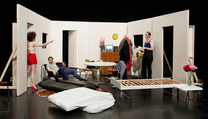 Devant nous trois acteurs dans l’exercice d’un processus : un système de répétition de gestes qui mène rapidement à une folle fresque improvisée. Pas de personnages ni d’histoires prédéfinis, seulement un processus de jeu, un contenu (ou concept) et une forme dans laquelle se dérouleront les événements à venir en direct devant nous. Tout est encore possible, tout est encore inconnu.