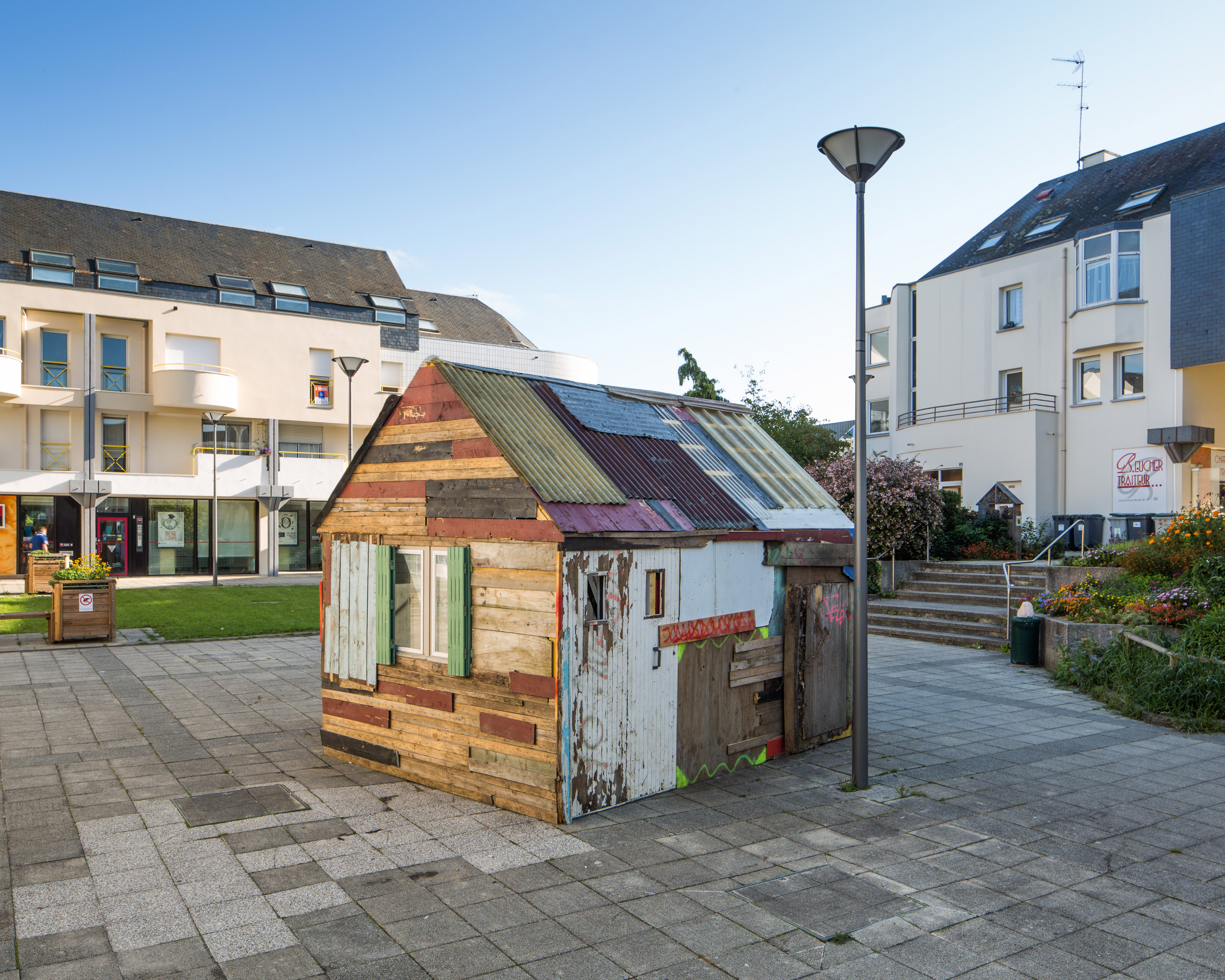 Une autre pièce qui fonctionne sur le principe de récits et d’histoires, est celle d’Anaïs Touchot, Ça sentait la poiscaille. Elle a installé une cabane sur la place de la Poste de Vern, construite à partir de bois et de matériaux récupérés. L’objectif de l’artiste était d’utiliser 127 bouts de cabanes différentes. Ils font référence à l’une des rencontres de l’artiste faite au Canada, avec un homme qui construisait une maison avec 127 bouts d’autres maisons. Elle avait envie de lui rendre hommage à travers cette pièce. Pendant plusieurs mois les morceaux ont été récoltés, ils portent tous une histoire. Sa cabane est aussi la réunification des débris d’anciennes œuvres (Help me Hit me, Si j’étais démolisseur…). Ça sentait la poiscaille fait écho aux pêcheurs canadiens qui faisaient glisser leur cabane sur les lacs gelés pour pouvoir pêcher, à l’abri du froid.