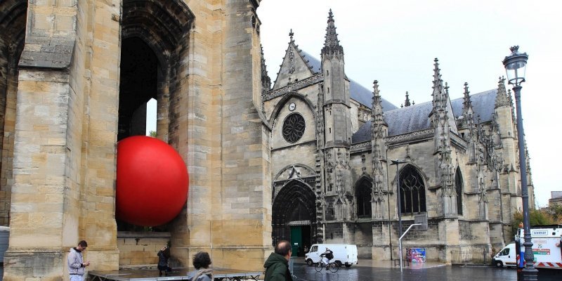 Redball Bordeaux, la gigantesque boule rouge de cinq mètres de diamètre de l’artiste new yorkais, sculpteur et vidéographe, Kurt Preschke, investit des lieux mythiques de la cité bordelaise pour, « compressée », en révéler une nouvelle existence. Ainsi, au lieu « d’effacer » l’Opéra de Bordeaux de l’architecte Victor Louis, la Flèche de l’église Saint Michel qui culmine à plus de cent mètres, la monumentale Porte Cailhau, le bâtiment historique de la Gare Saint Jean, ou encore les immenses piliers contemporains du tout nouveau Pont Chaban Delmas, cette sphère écarlate en souligne les lignes en les donnant à voir sous un autre angle. Objet ludique et improbable, cette installation mobile crée (simplement) la surprise, déclenche (souvent) le sourire et (immanquablement) « redonne de la couleur » au paysage urbain figé dans une perfection déjà (trop) pensée.