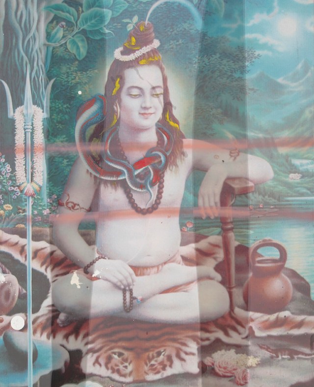 Autour de la figure du dieu hindou Shiva, Julian Schnabel développe une conversation entre la culture occidentale et les traditions de l’Orient. En appliquant ses mots, gestes et formes abstraites, à l’huile et à la résine, sur des images préexistantes de Shiva imprimées sur polyester, Julian Schnabel se confronte à un “palimpseste de la représentation” , en intervenant a posteriori sur une imagerie déjà créée et connue.