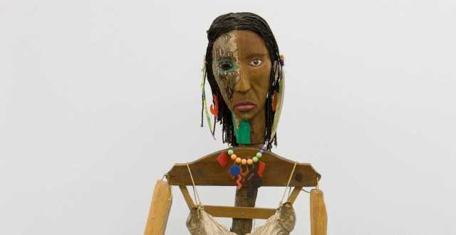 Jimmie Durham, Malinche, 1988–92. Guava, pine branches, oak, snakeskin, rope, polyester bra soaked in acrylic resin and painted gold, watercolor, cactus leaf, canvas, cotton cloth, metal, feathers, plastic jewelry, glass eye. 70 × 23 5⁄8 × 35 in. (177 × 60 × 89 cm). Stedelijk Museum voor Actuele Kunst (S.M.A.K.), Ghent, Belgium. Photo: S.M.A.K. / Dirk Pauwels.