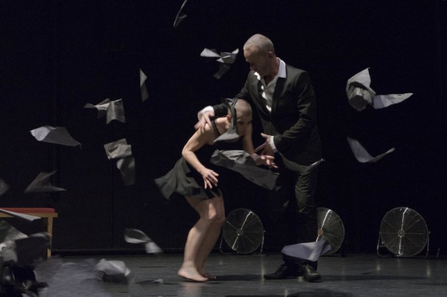 Les deux interprètes s’adonnent à un savoureux jeu de chassés-croisés où le flot de paroles de l’un (« Fluxus de souvenirs qui flottent dans ma tête comme des naufragés… ») trouve écho dans la geste du corps de l’autre, pris et dépris chacun dans une conversation à élans rompus. Ce jeu, tout sauf innocent, se déroulant sous le regard goguenard du maître chorégraphe qui n’hésite pas à délaisser à plusieurs reprises son bureau – dont la taille, minuscule, fait ressortir par contraste son imposante stature – placé à l’une des extrémités de la scène, pour s’inviter dans la danse en esquissant plusieurs pas endiablés ou encore en jouant des rythmes effrénés, guitare en main.