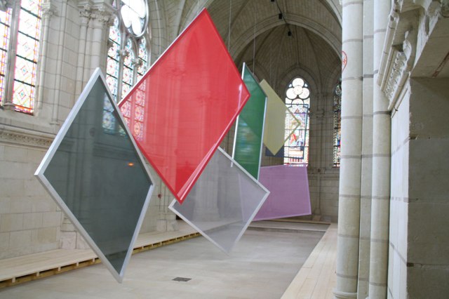 Cécile Bart « Moteur », 2013. 7 peintures/écrans, peinture glycérophtalique sur Tergal « Plein jour », châssis aluminium, câbles, moteurs – copyright the artist / Galerie Valentin Paris.