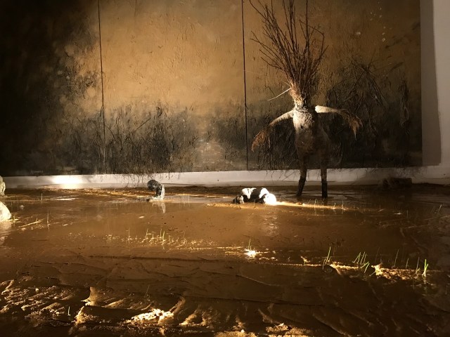 Avec toute cette argile déployé dans la Galerie la vie prend forme, une herbe tendre prendre le pas sur ce qui n’était qu’une légère couche d’argile, des fleurs poussent à partir de ventre terreux disloqués. Ni humains, ni animaux vraiment, les organismes imaginés par Olivier de Sagazan prennent vie. Là une carotte, ailleurs des pâquerettes, des mauvaises herbes, la vie indisciplinée, curieuse, en perpétuelle métamorphose.